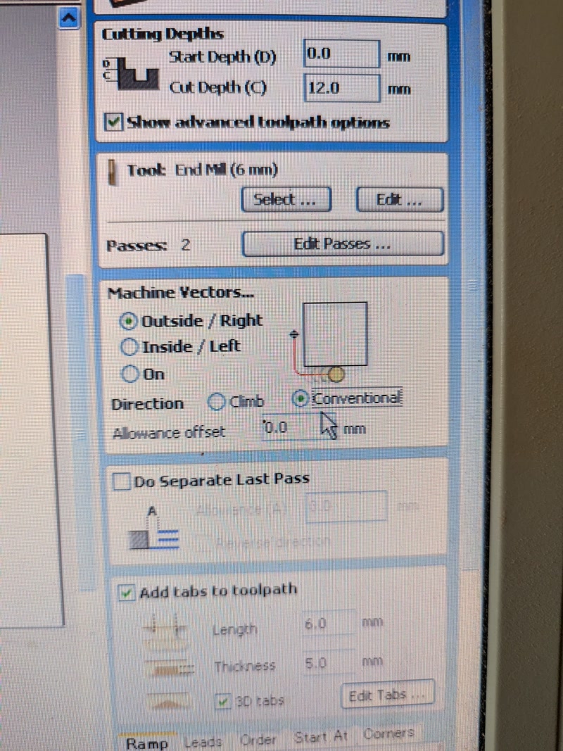 - Cutting depth > Material thickness (in this case, 12mm)