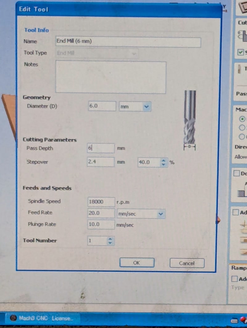 - Select the tool to use (end mill or bit), and set parameters such as rotation speed, cutting depth (Material thickness (in this case, 12mm)), and tool diameter (6 mm).