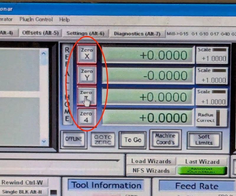 - Click the “Zero X”, “Zero Y”, and “Zero Z” buttons to record the origin in Mach3.