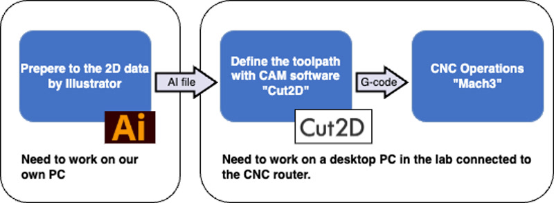 The workflow from CAD data preparation to CNC milling at FabLab Hamamatsu is shown in the following diagram.