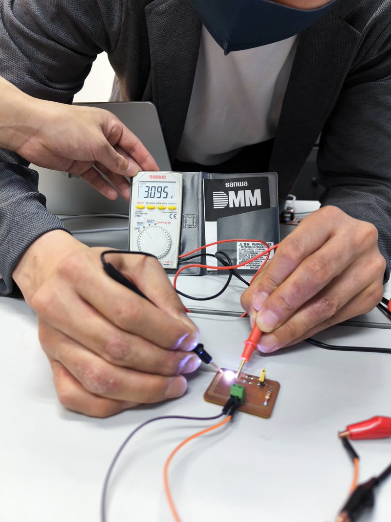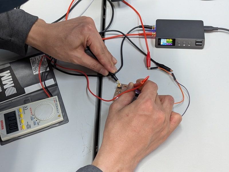 For this week’s group assignment, we used the test board that was already in Fablab Kannai to measure voltage, current, and power consumption. This test board has two types of resistors (1kΩ and 100Ω) and one LED connected to a Shunt Resistor (1Ω).