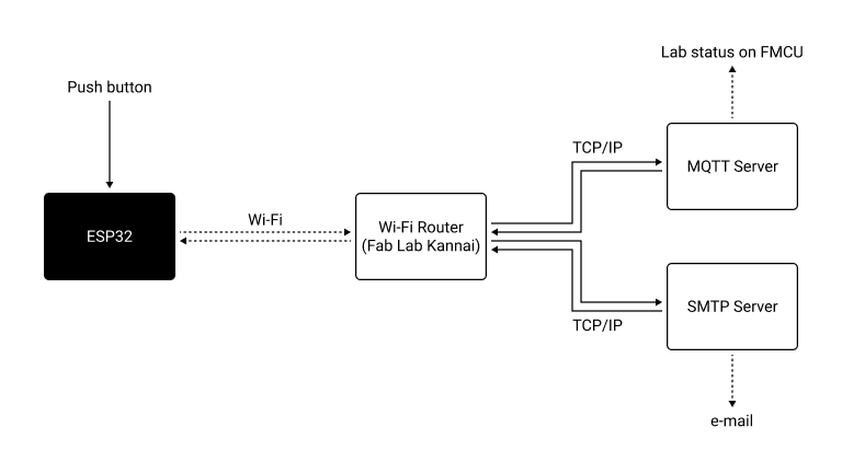 Firstly, we tried the FMCU, a button device that shows when a Fab Lab is active by sending a signal online. In addition to lab status, we added e-mail notifications to FabLab Kannai members when the button is pushed.