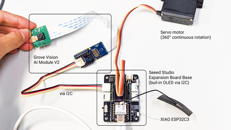 In this setup, both the OLED display and the Grove Vision AI V2 module connect to the XIAO ESP32 using the I2C protocol, which uses only two wires: SDA (data) and SCL (clock). Each device has a unique address, so the ESP32 can talk to them one at a time over the same wires.