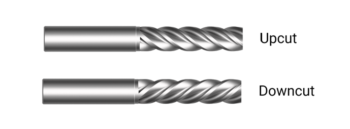 - Upcut: Pulls chips upward, good for metals but may cause splintering in wood.