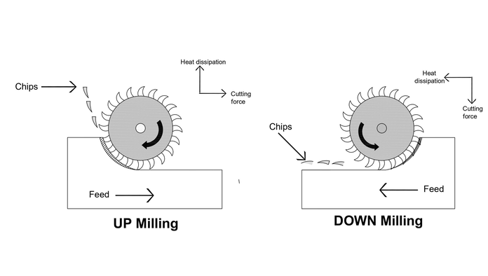 - Up Milling (Conventional): Cutter moves against feed direction, causing more heat and force.