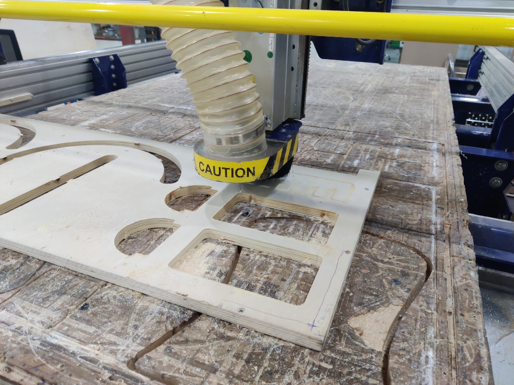 Material Handling Used saws to trim the plywood boards before mounting them on the CNC.