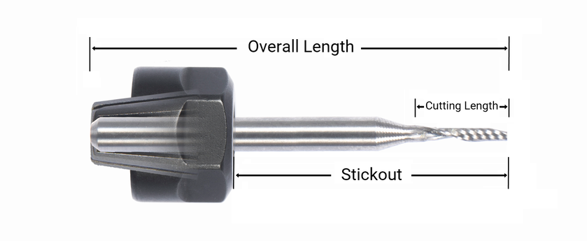 - Stickout: Distance from the collet to the bit’s tip. The more stickout, the less rigid a tool is. If it sticks out too far, the bit is prone to be bent by the cutting force.