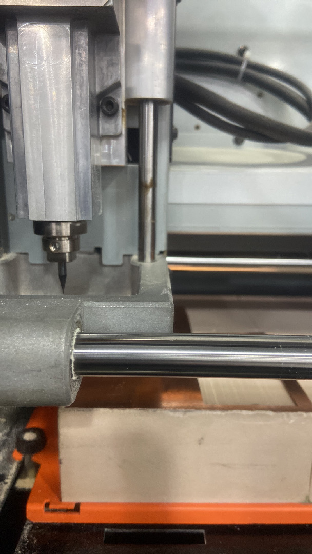 - The machine uses a high-density plastic sacrificial plate beneath the material to protect the bed.