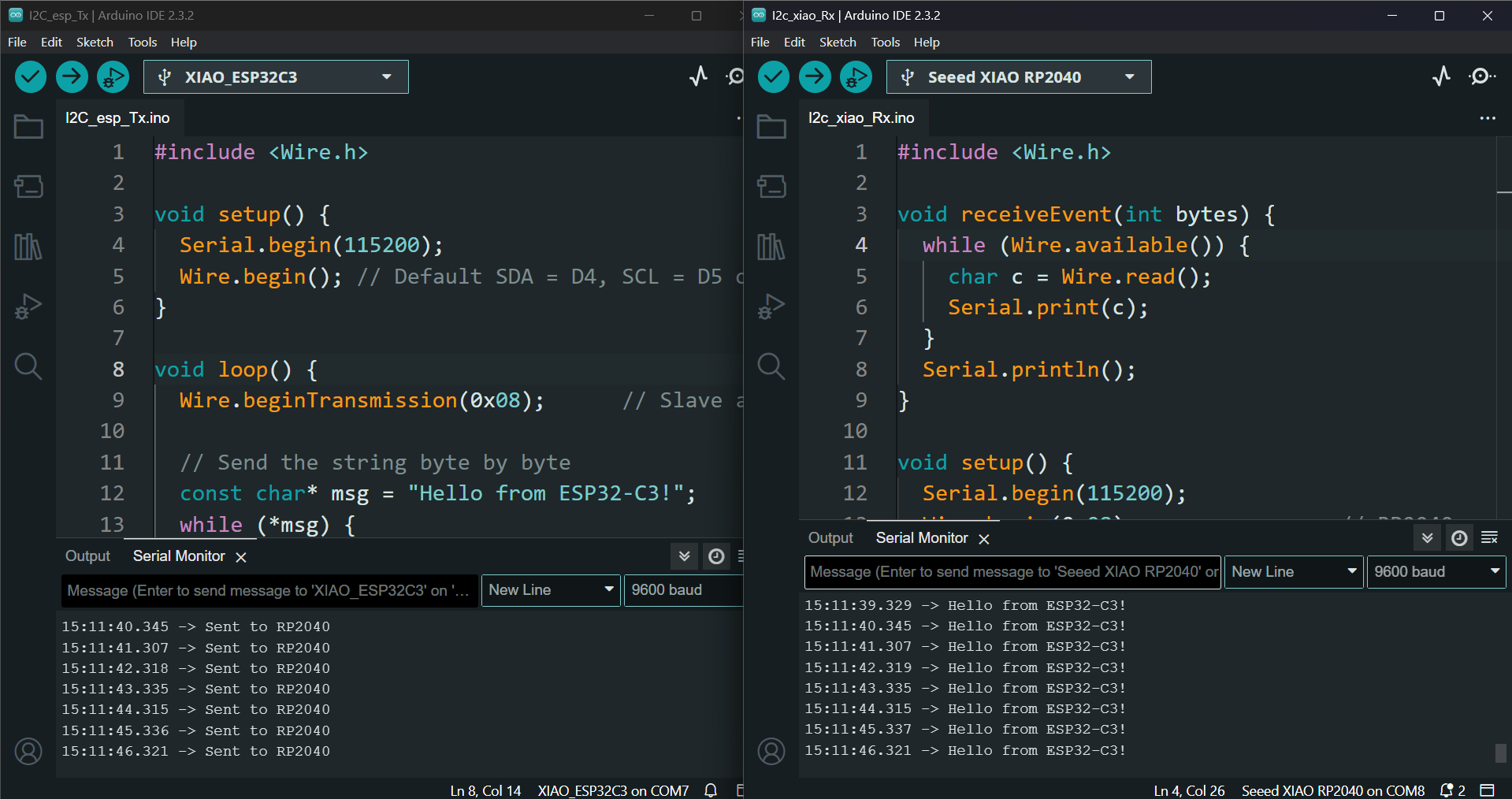 This section explains how to connect an XIAO RP2040 to the XIAO ESP32-C3 using the I²C communication protocol.