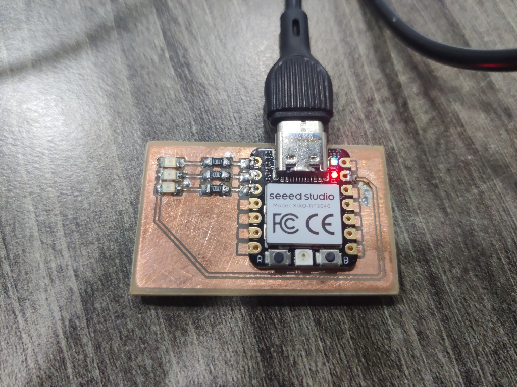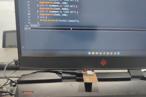 To begin with, I used the Arduino IDE to perform basic serial communication. I connected three LEDs to a board I designed during the Input/Output week. Using simple serial commands sent from the Serial Monitor, I could: