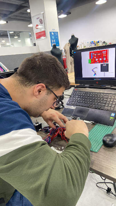 During Machine Week, we designed and built FabLab in a Box—a compact, articulated robotic arm capable of plotting, laser engraving, and pick-and-place operations. Inspired by open-source projects like the “20 Square Feet Factory,” we extended the concept to develop a versatile robotic platform using articulated kinematics, salvaged components, and custom 3D-printed parts. The system was integrated using RAMPS 1.4 electronics, Marlin firmware, and multiple toolheads including a gripper, pen holder, and laser module. Through calibration, inverse kinematics programming, and practical testing, we were able to simulate real-world robotic tasks and prepare for future add-ons such as a 3D printing head and 4th-axis control.
