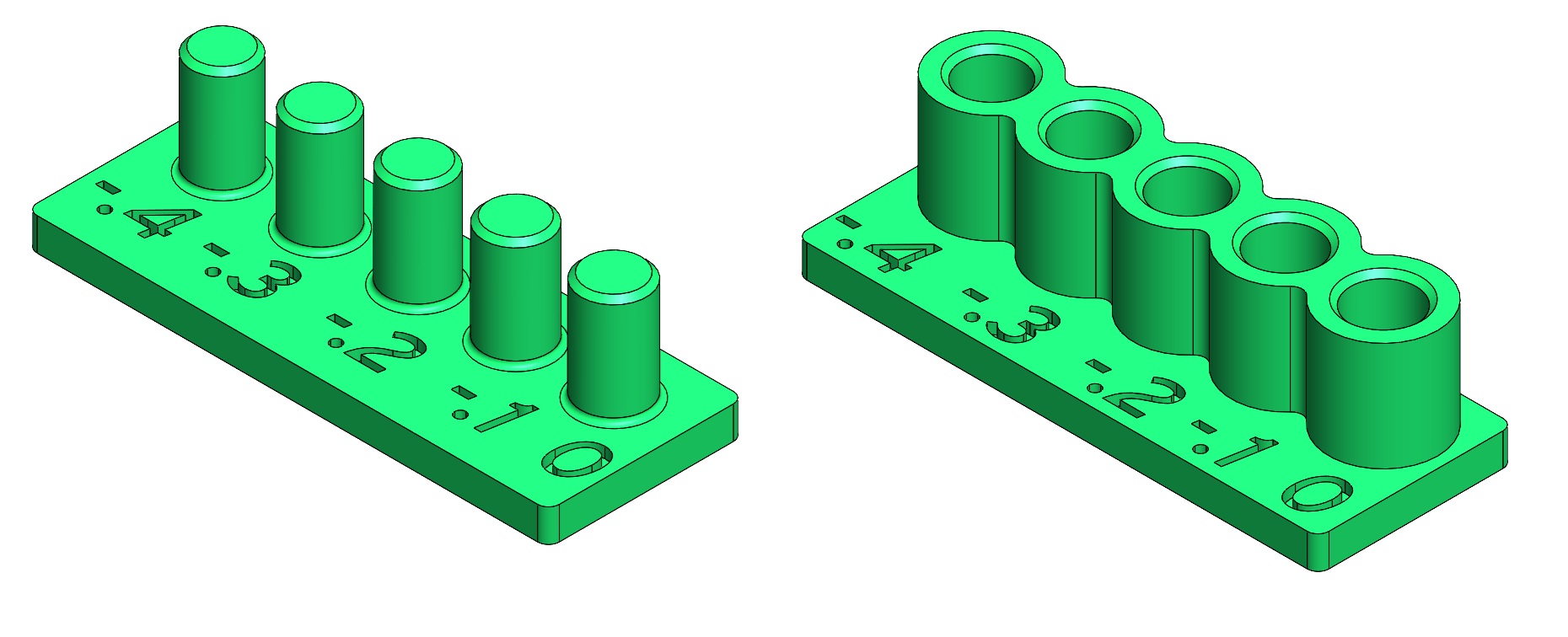 We also ran a test to evaluate the fit of cylindrical bosses into cylindrical holes. We made a CAD file with 5 bosses and 5 extruded hollow cylinders with different diameters. We tested both 3mm and 6mm hole sizes. We started by doing nominal in the center and going up by 0.1mm on one side and down by 0.1mm on the other side (range of 2.8-3.2mm and 5.8-6.2mm). However, after testing those, the fit was too tight for a slide fit. So the range was adjusted on the 6mm test jig to 5.6-6.0mm in the CAD.