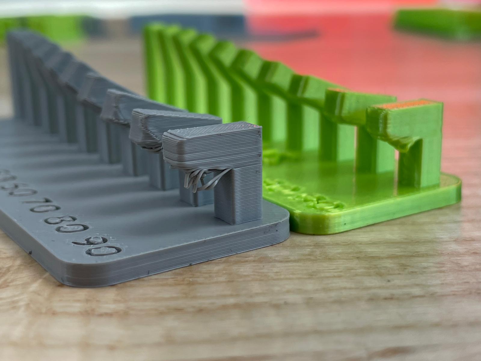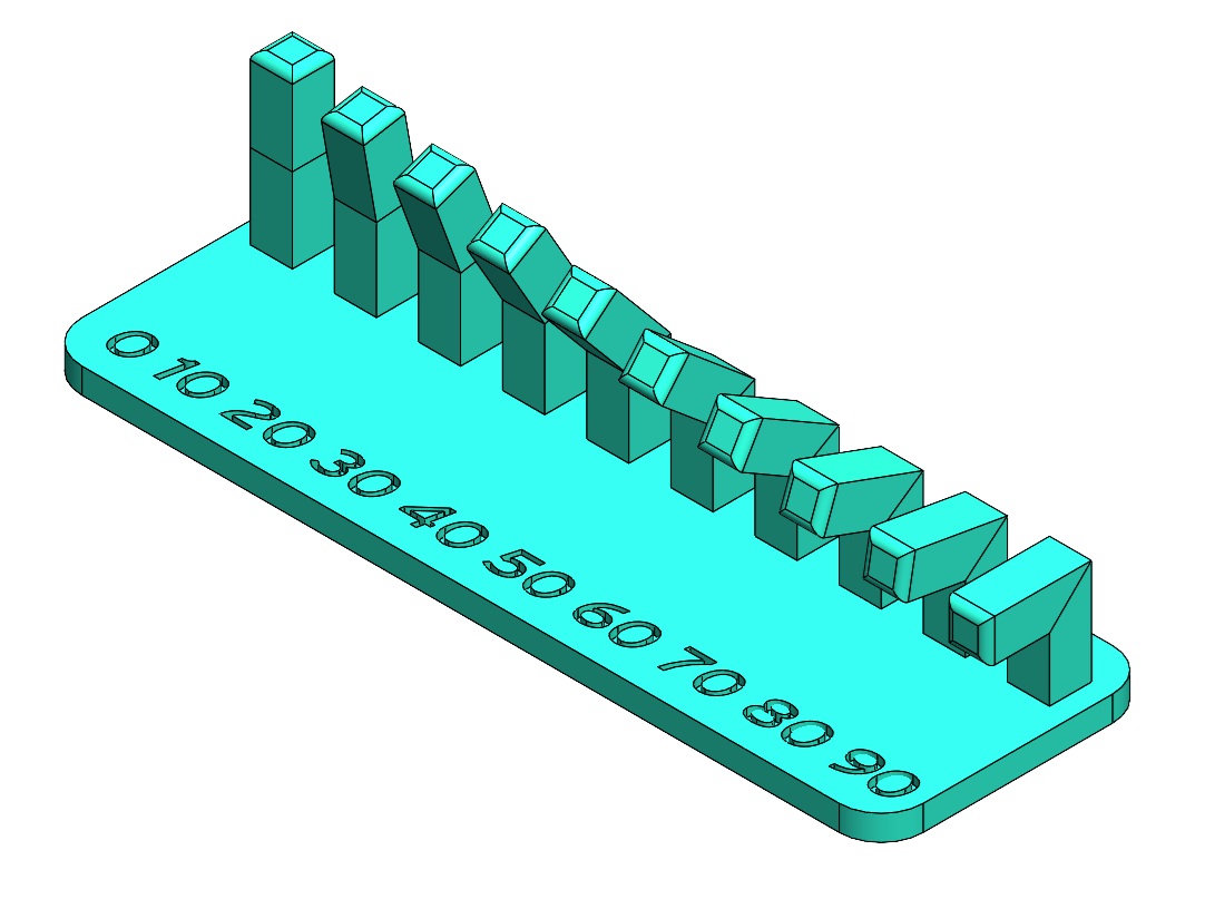 For overhang performance we made a jig with extrusions with bends from 0 to 90 degrees in 10 degree increments.