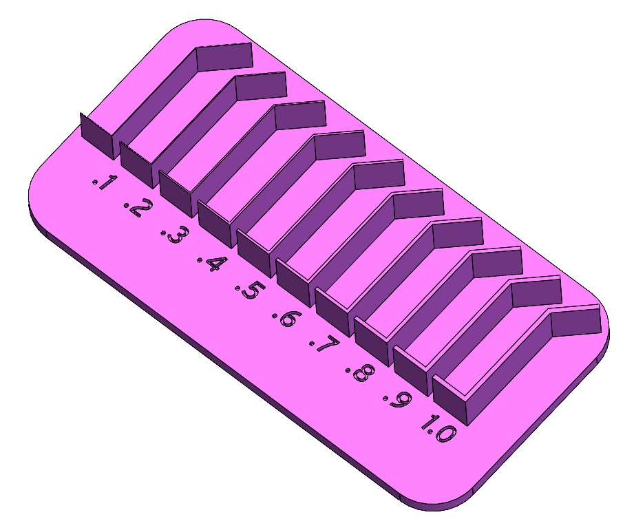 To test the minimum thickness performance of the printers, we made a jig in Solidworks to make bent walls in 0.1mm increments from 0.1mm to 1.0mm. The shape of the wall was to test both the X and Y performance to see if there was any discrepency.