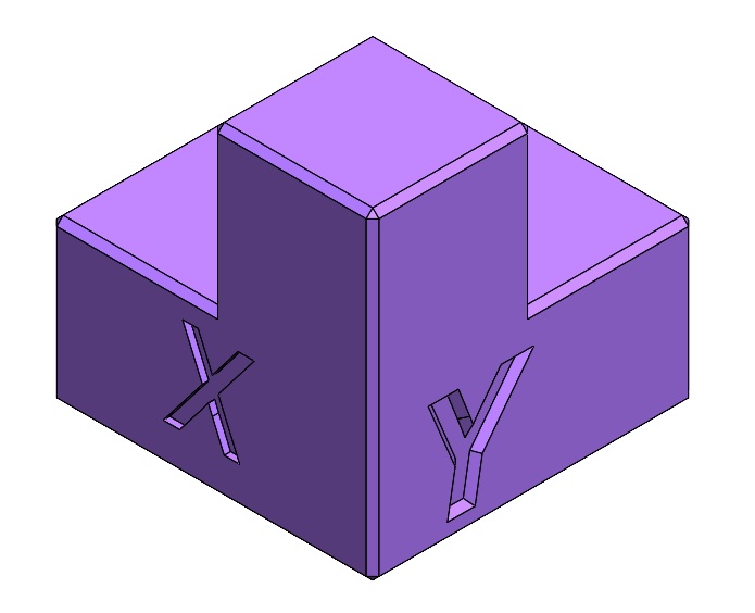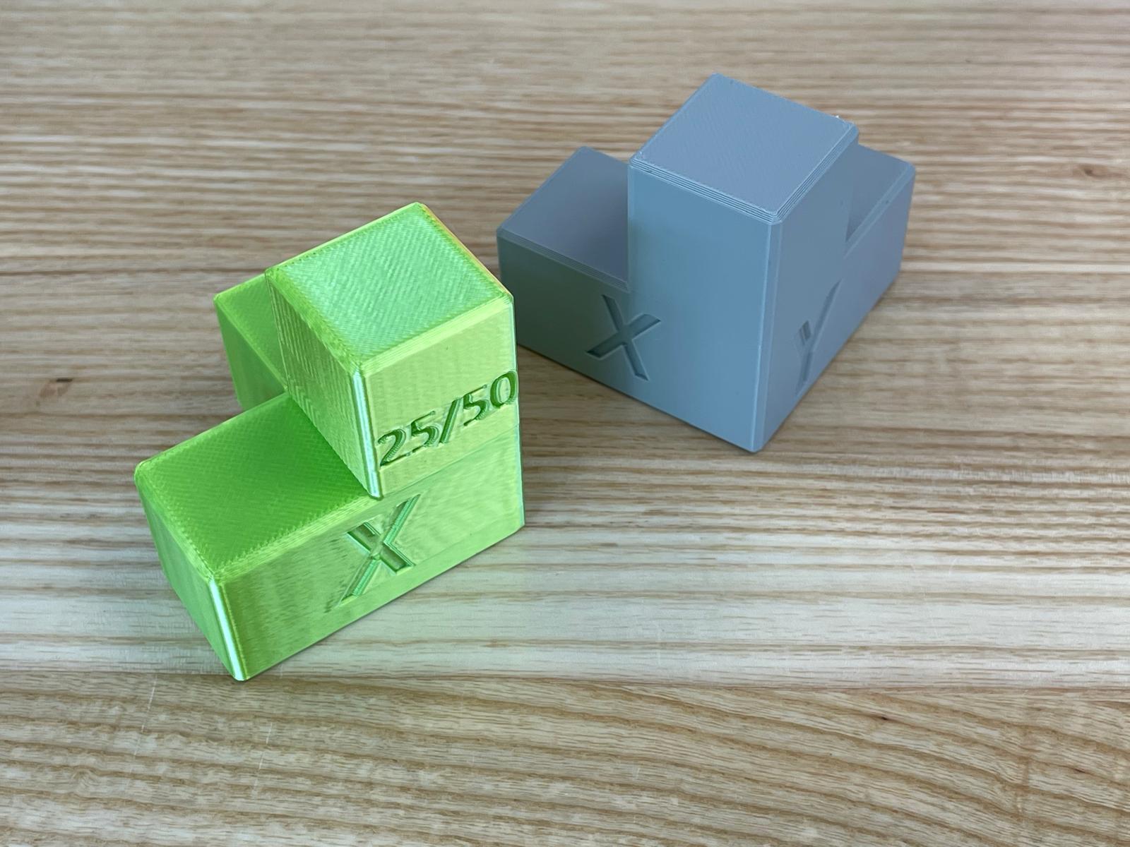 We made a jig to test the dimensional accuracy of the prints. We made a half cube that had dimensions of 25 and 50mm on each axis. Then we put chamfers on the corners to facilitate more accurate measurement with calipers.
