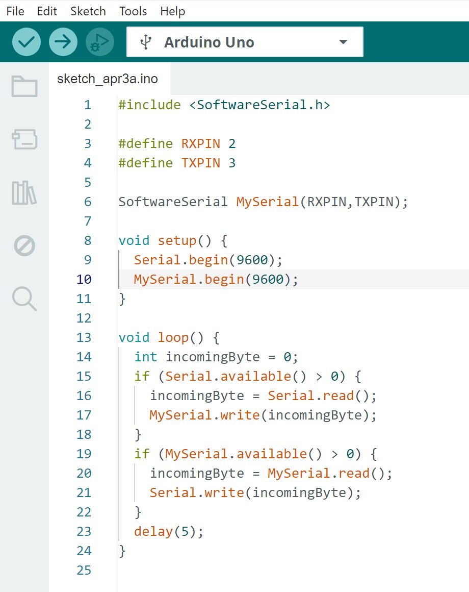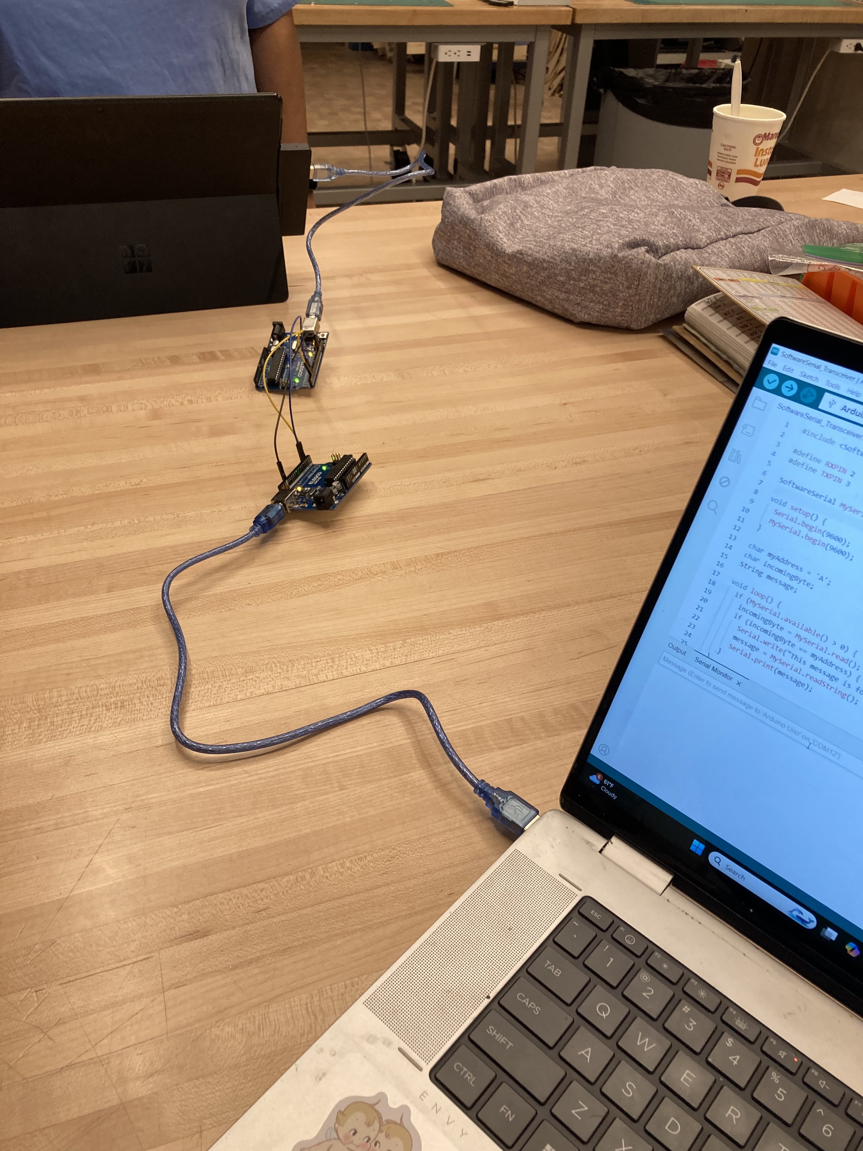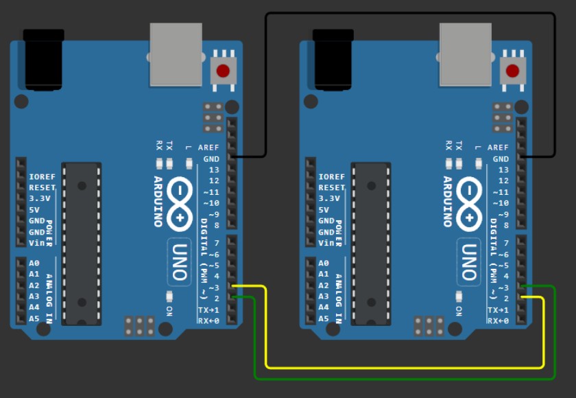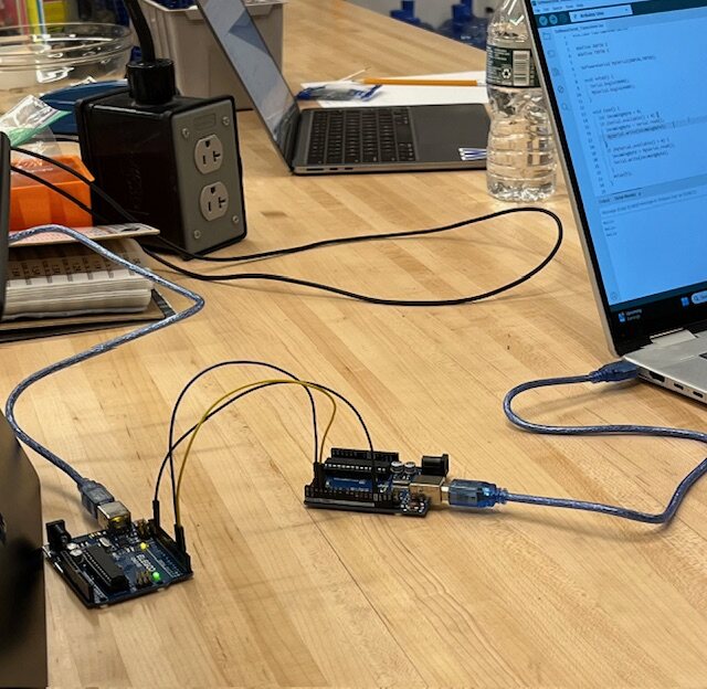 This week in the lab we learned to comminicate information between two projects. We connected two Arduino Unos together with each one connected to a different computer. Using the code below, the two computers could send and receive messages between each other. The code & diagram were provided by our local instructor, Jason Goodman. This type of communication is referred to as serial communication where data is sent bit by bit over a single line. For this type of communication we used the TX and RX pins on the Arduino Uno board. We crossed wires between the RX(receiver) pins and the TX(transmitter) pins. This allowed us to type messages to each other such as "Hello" and so forth back and forth between the two serial output panels in Arduino IDE.