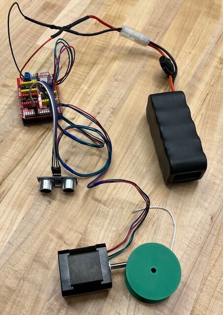 We used pins D12 & D13 for the ultrasonic sensor. It's important to ensure that the pins being used aren't also being used for the stepper motor (using the pins on the right side is a safe choice). We also plugged in the sensor to the 5V and GND pins on the right side of the shield. We needed a seperate battery for the arduino to work, so we used a personal charger.