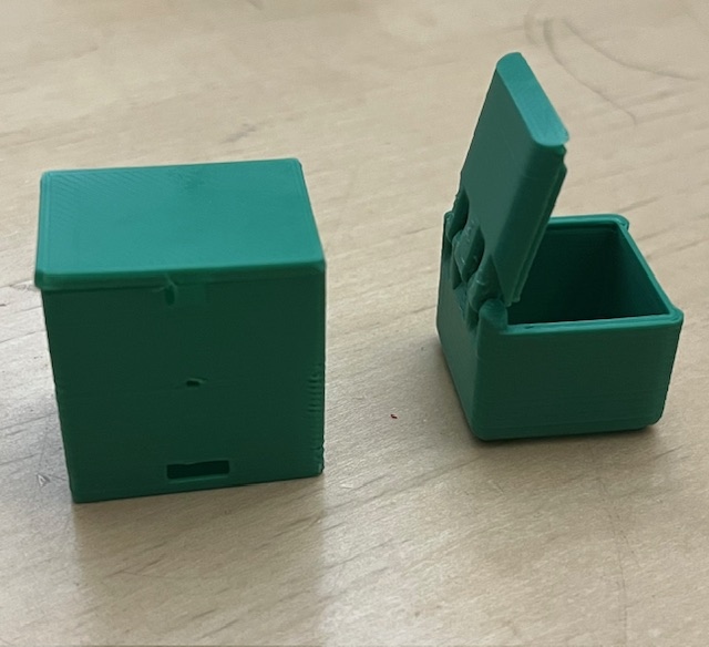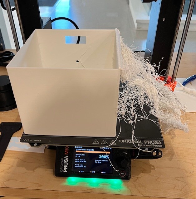 We designed and constructed a box for the machine's housing, you can check Gillian's documentation for more details on this section. We designed one that had the lid attached with a latch and the other is a hinged box design we found on Thingiverse by povsky. The group decided that they liked the hinged box better, so we edited the file to have holes for the string and the sensor. However, when trying to make a full sized 3D print, the first one stopped 25% through and the second one the box printed by the lid became spaghetti. To save time and reduce waste, we decided to just use the second box and do something else for the lid.