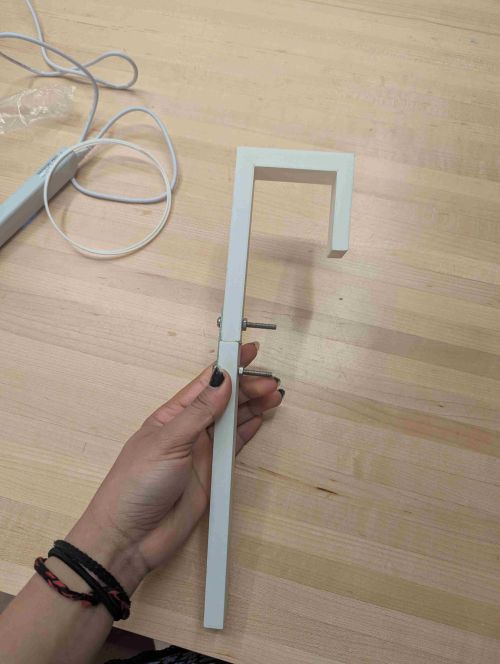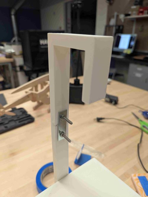 One issue that came up was the hook not being long enough to fit on the beam and hold the box. We were limited by the size of the 3d printer plate, so we made an extension. We took the width of the original hook and made it the same as the extension, then we made it 7 inches long so that there was enough space. The hook and the extension are connected through brackets, which we made a hole in by soldering through the PLA and using a nut and bolt to hold it in place.