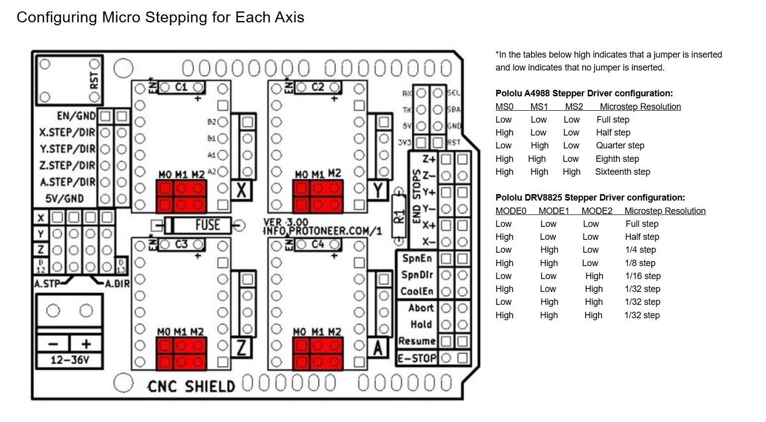We used quarter steps for the stepper motor to ensure a less jerky movement. View the stepper driver configuration below (src here).