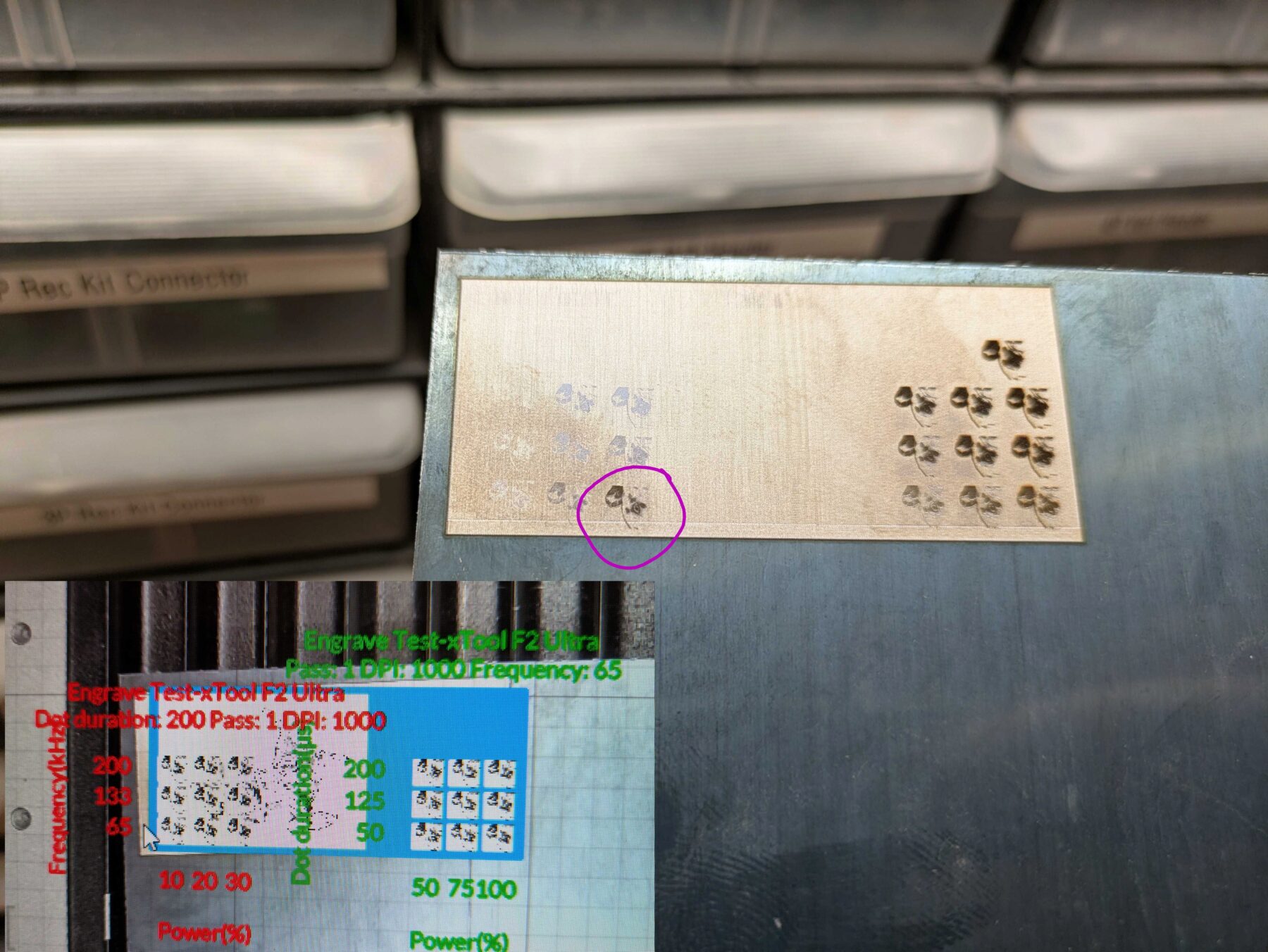 We tried to engrave a part of my framework laptop. We supposed that the part is a type of aluminium. We started with some test patches on the underside.
