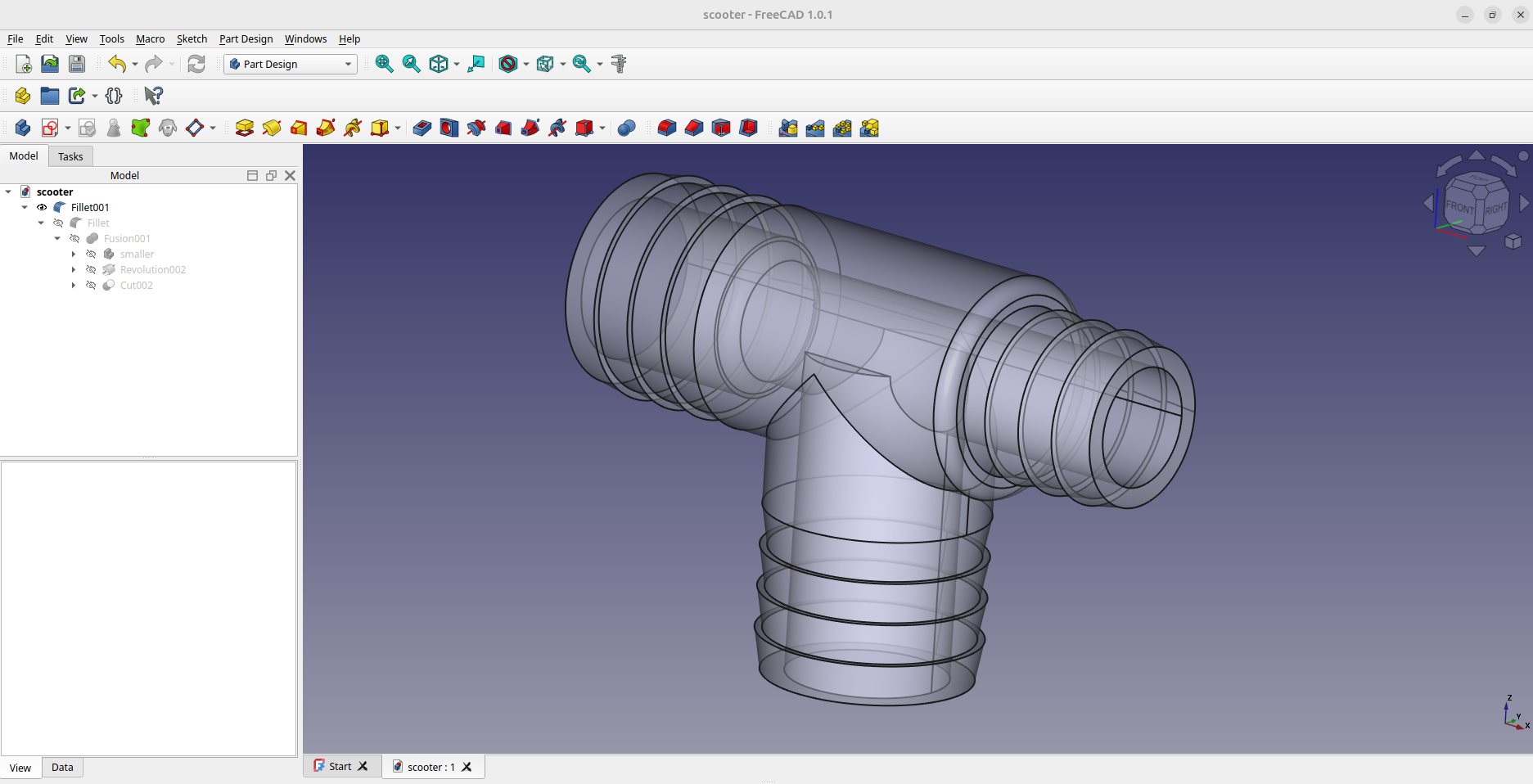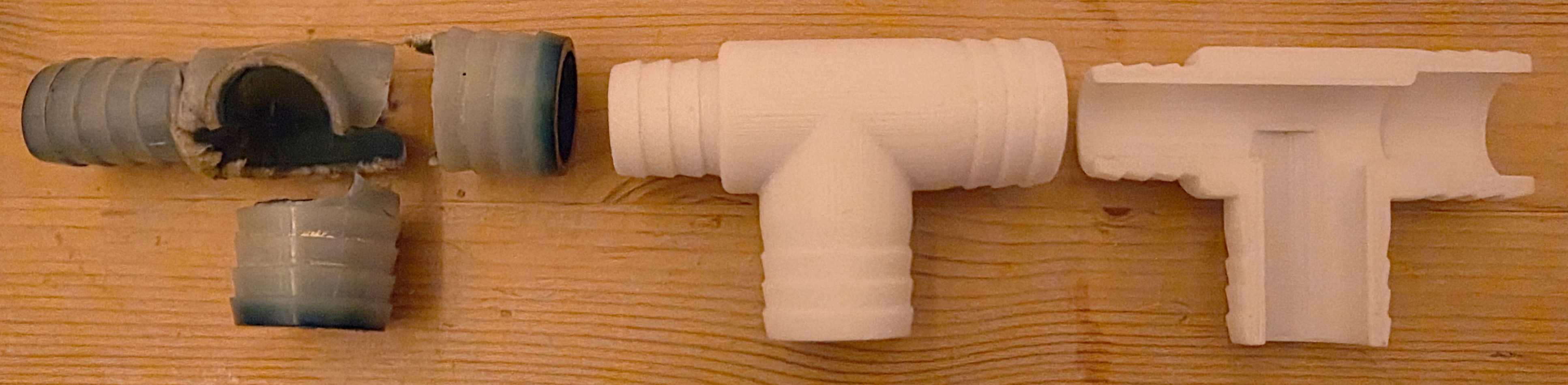 Replacing a broken snowmobile cooling coupler¶ From an old model that would be slow and expensive to obtain a replacement part (Neil Gershenfeld) Broken coupler, replacement, and cross-section¶ CAD of the design¶ coupler.FCStd