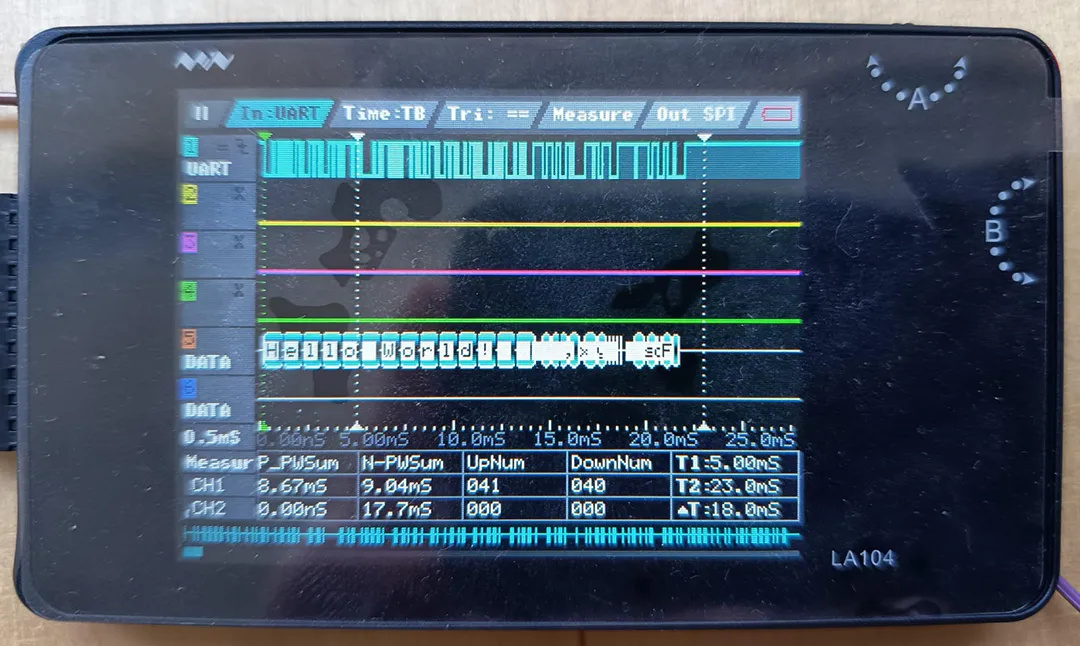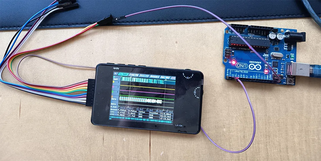 The logic analyzer was used to observe digital communication between the microcontroller and connected components. While the oscilloscope shows analog waveforms, the logic analyzer interprets signals strictly as digital states. It recognizes whether a signal is HIGH or LOW and records these states over time. When connected to communication lines, the logic analyzer was able to capture entire data transmissions. It also allowed us to decode protocol-level information, such as clock signals and transmitted data bits. This made it possible to see not only that a signal was switching, but also what information was being sent. Compared to the oscilloscope, the logic analyzer is less focused on signal shape and more focused on digital logic and communication structure. It is particularly useful when working with protocols, because it translates electrical activity directly into readable data. For the experimental setup, we used an Arduino Uno connected to a potentiometer. The potentiometer was wired to an analog input pin of the microcontroller in order to vary the input value manually during operation. The analog value read by the Arduino was used to control the delay inside a simple HIGH–LOW switching loop. The program continuously toggled a digital output pin between HIGH and LOW, while the duration of each state depended on the measured analog value. By turning the potentiometer, the delay time changed in real time. This directly influenced the switching frequency of the digital output signal. Instead of observing the signal with an LED, we measured the output using the oscilloscope and the logic analyzer. As the potentiometer position changed, the frequency of the square wave visibly increased or decreased. Therefore the frequency can be calculated with f=1/(2*delay). This setup clearly demonstrated how an analog input can dynamically control digital timing behavior in a microcontroller system.