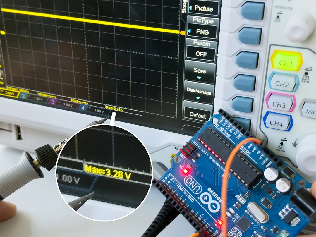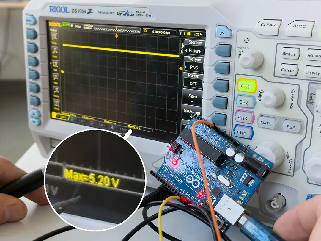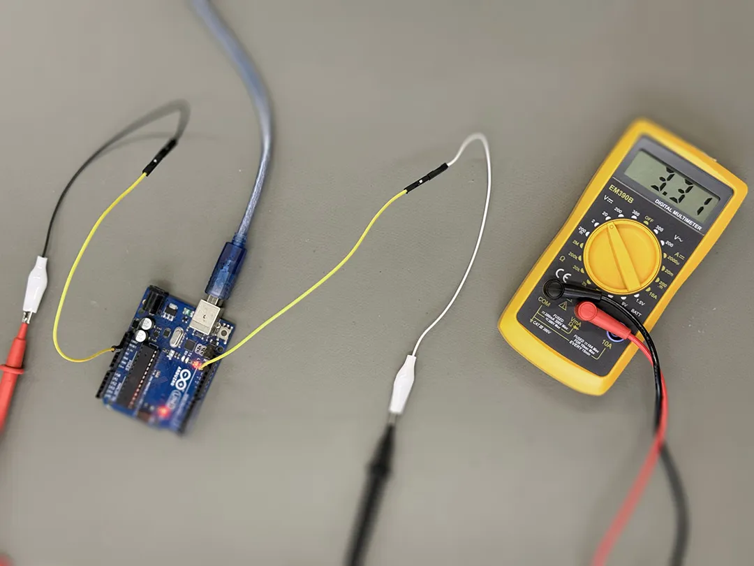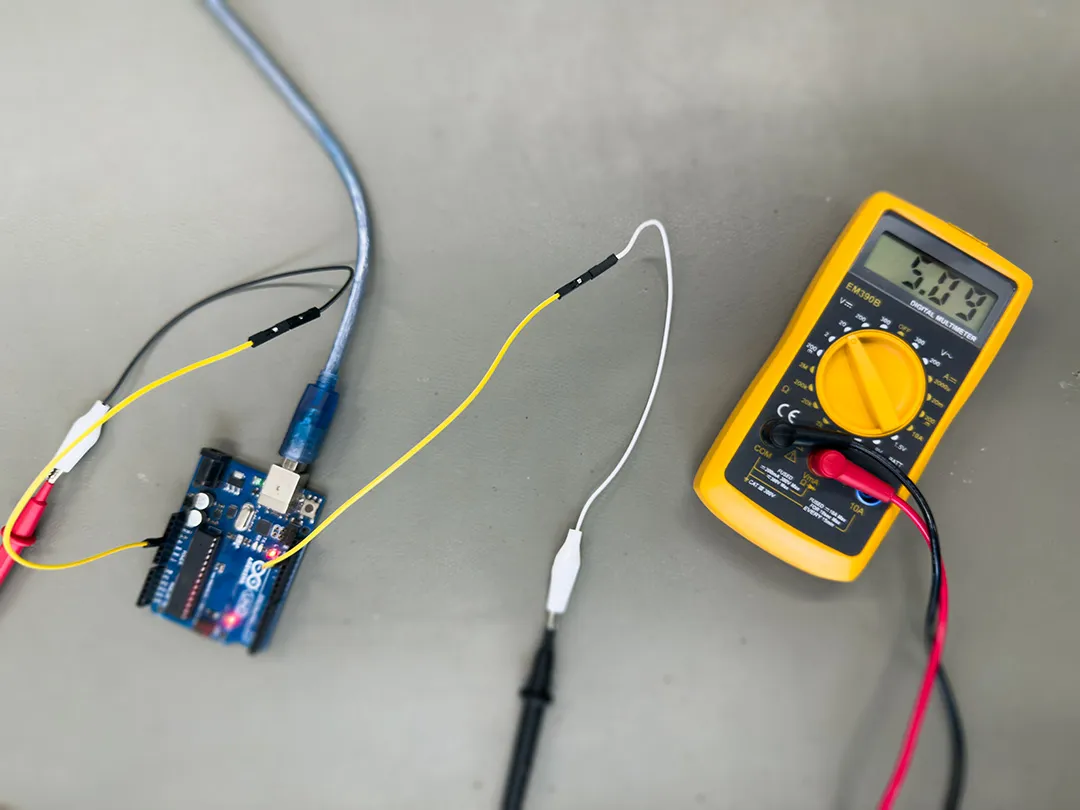 The multimeter was used to measure instantaneous voltage values on the board. In contrast to the oscilloscope, it does not show the signal over time but instead provides a single measured value. This makes it especially useful for checking stable DC voltages. When analyzing the Arduino Uno, we used the multimeter to verify the supply voltage and confirm that the board was operating at the expected 5V level. This ensured that the power supply was stable before investigating more complex signals. Although the multimeter provides less visual information compared to the oscilloscope, it is an essential diagnostic tool. It allows quick verification of voltage levels and helps identify basic issues such as missing power or incorrect wiring.