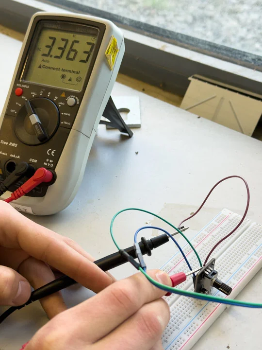 Next, we worked with a potentiometer, a manually adjustable voltage divider. By rotating the wiper, we directly change the ratio of the internal resistance, producing a continuously variable output voltage. We confirmed the full range:
