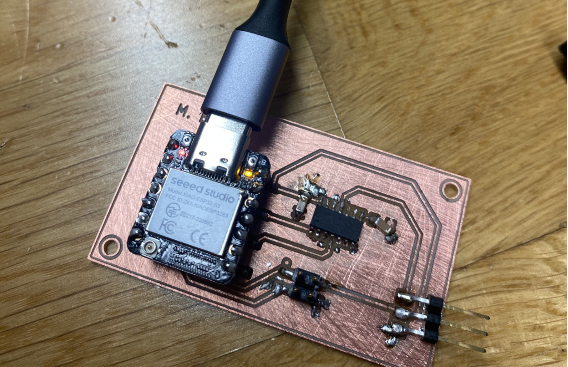 The board was then fabricated using the Roland SRM-20 in our lab. After milling the traces and outline, I soldered the components by hand and connected the OLED module for testing.