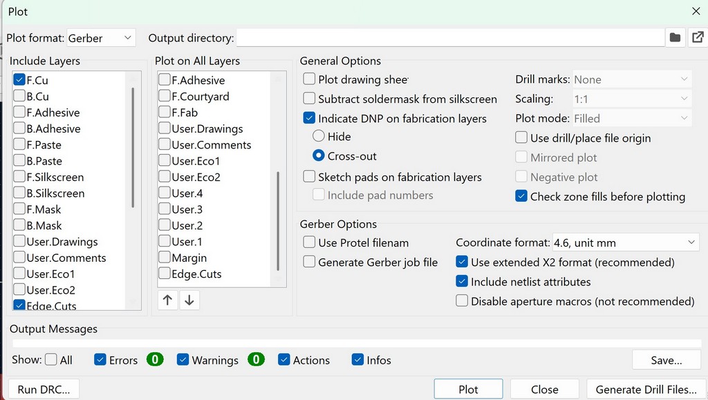 In the Plot settings, we selected F.CU and Edge.Cuts under "Include Layers" and then pressed the Plot.