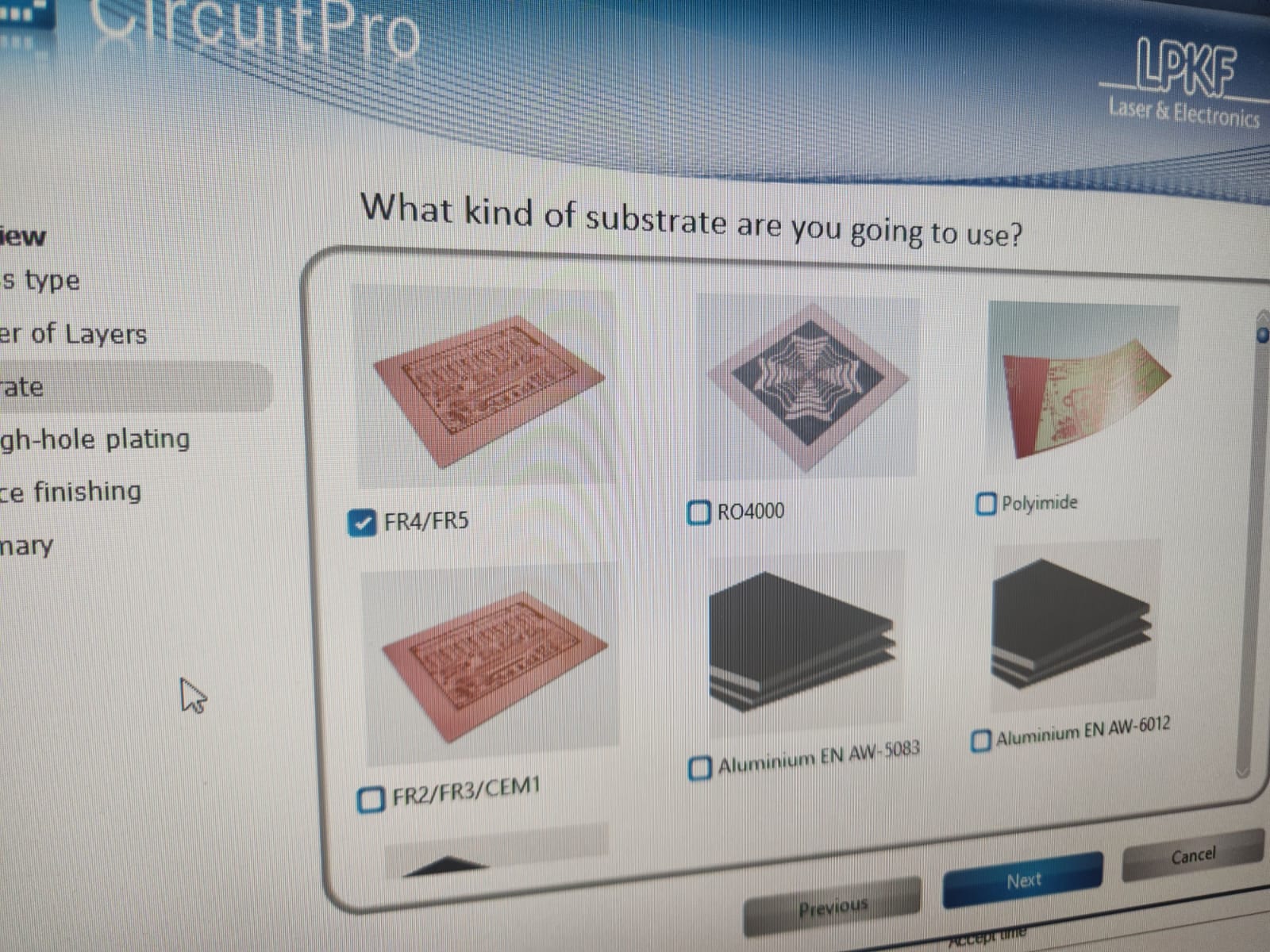 Material setting was next step, material thickness 1.6 mm and copper thickness was 35 um.