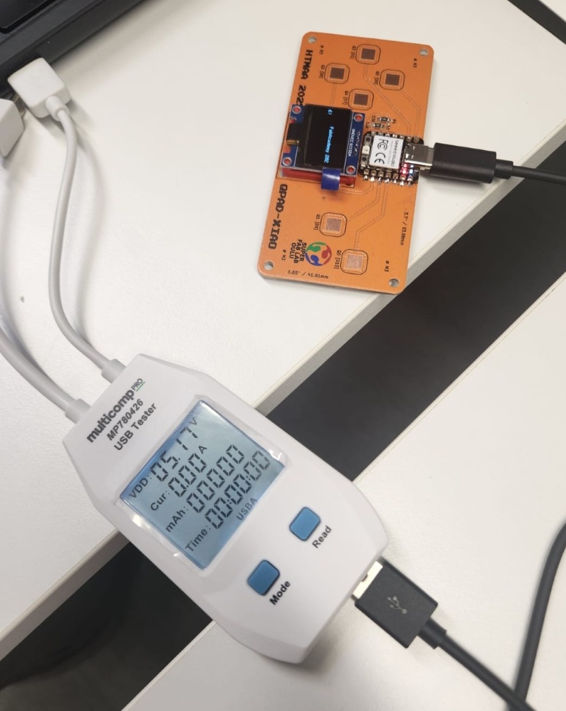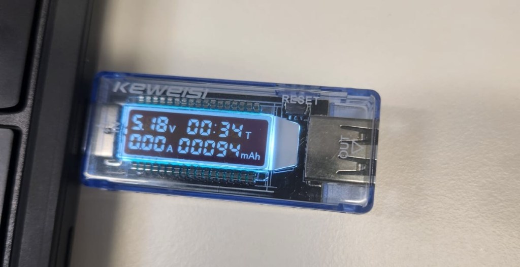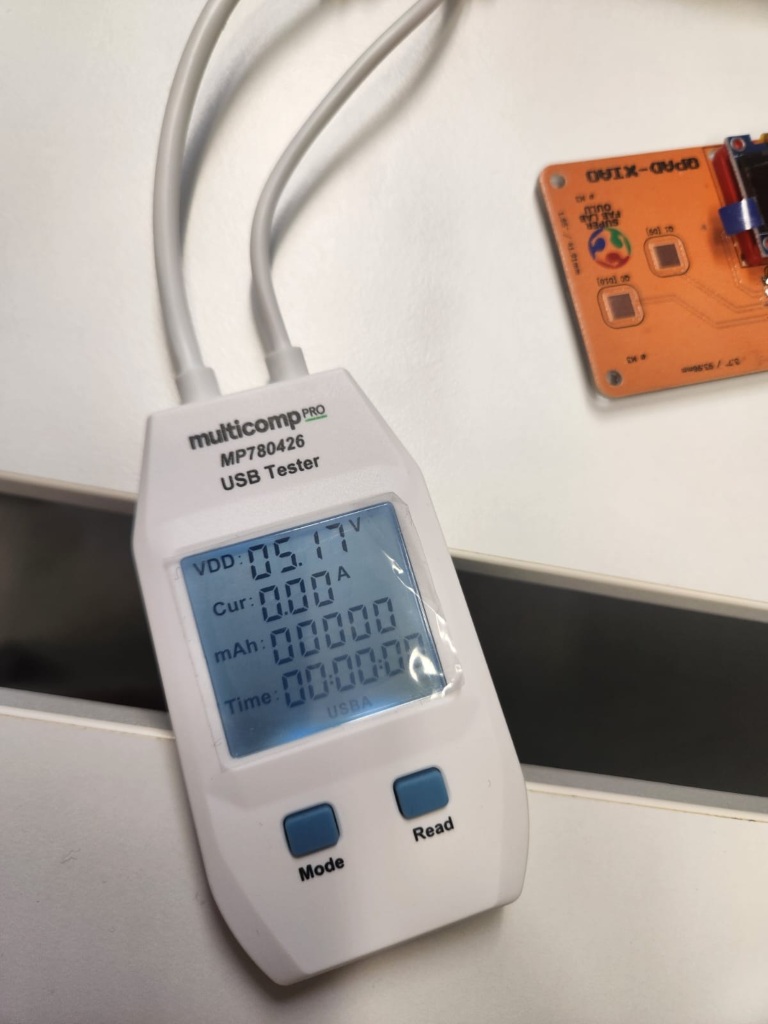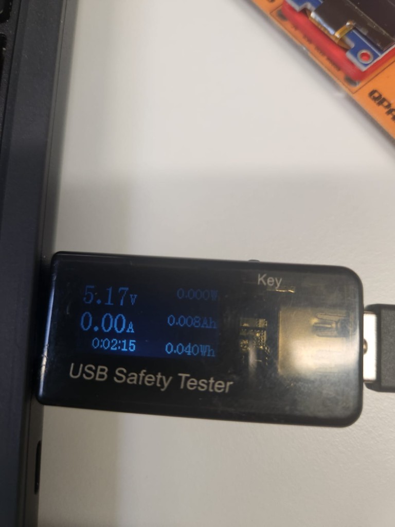 The four power meters produced noticeably different results. Two meters were unable to detect the OLED’s current draw and consistently showed 0.0 A, while the Keweisi meters provided more realistic values between 31–40 mA. This demonstrates how measurement accuracy depends heavily on the sensitivity and quality of the power meter. The additional test also showed that the Keweisi meter introduces its own small power consumption when placed in series.