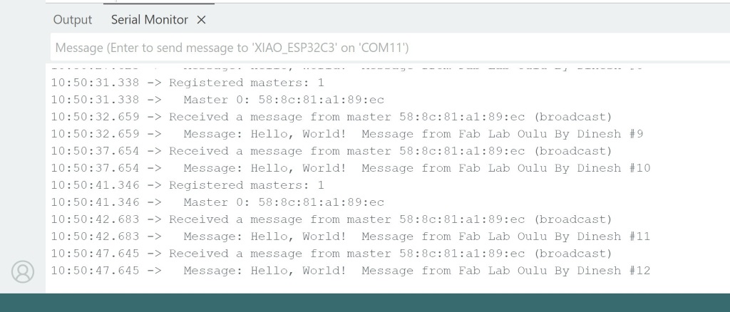 In this week’s group work, our task was to send a message between two projects. We used wireless ESP-NOW communication between three ESP32-C3 boards using the help of Juha and read this tutorial. WE used our boards that we designed and made in Week06 and Week07. ESP-NOW is a fast wireless protocol made by Espressif Systems. It lets ESP32 boards send small messages (up to 250 bytes) directly to each other without needing Wi-Fi or an internet connection.