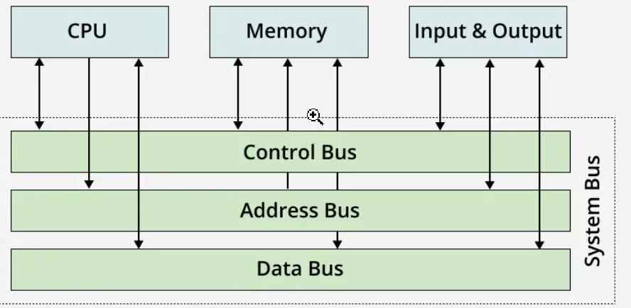 - Components like the CPU, memory, and input/output (I/O) devices are connected through a bus.