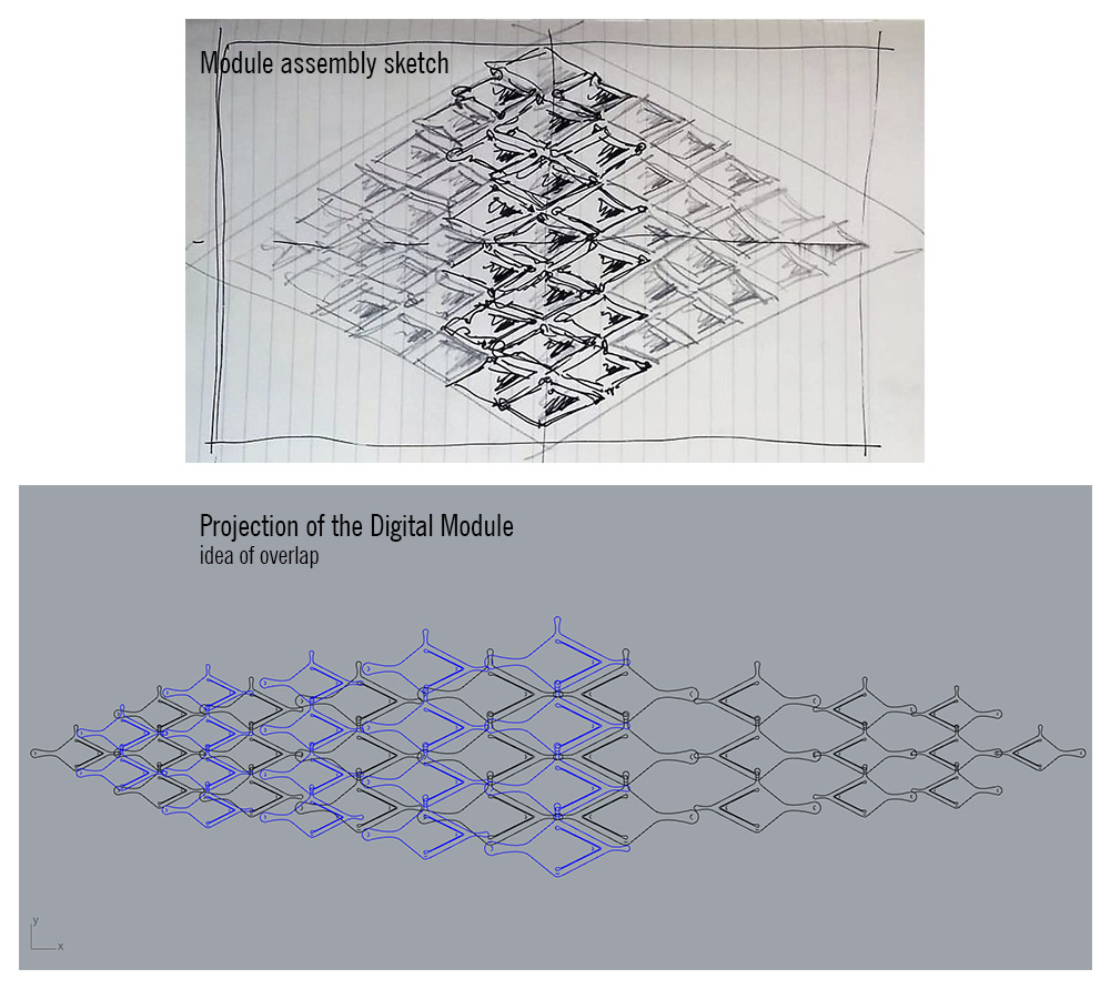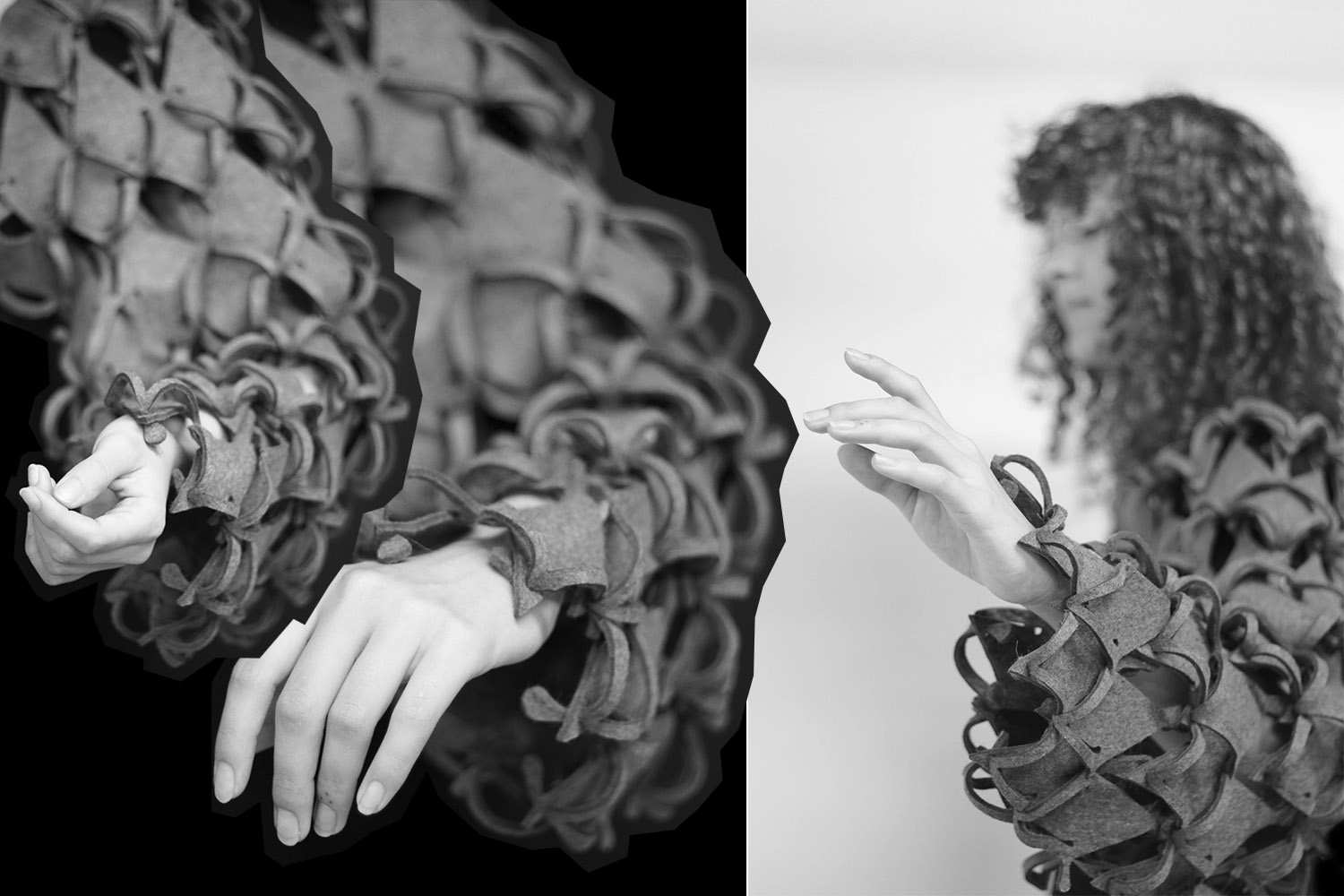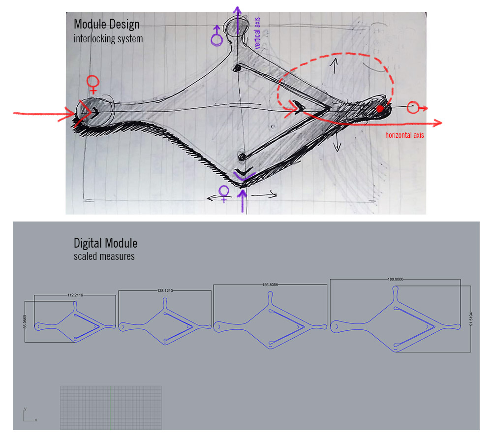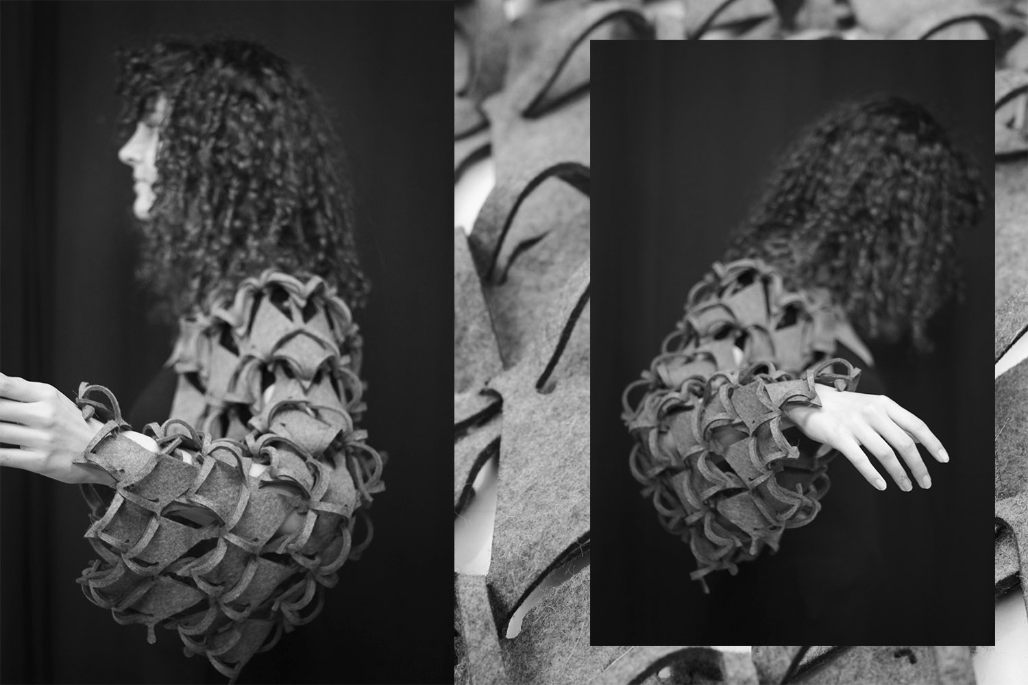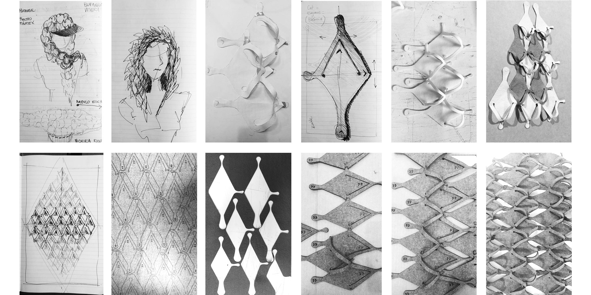 My first ideas (and drawings on paper) were aimed at composing through modules a piece to be worn on the head (a fusion between hood and scarf). This idea was mutating, as was the development of modular design.