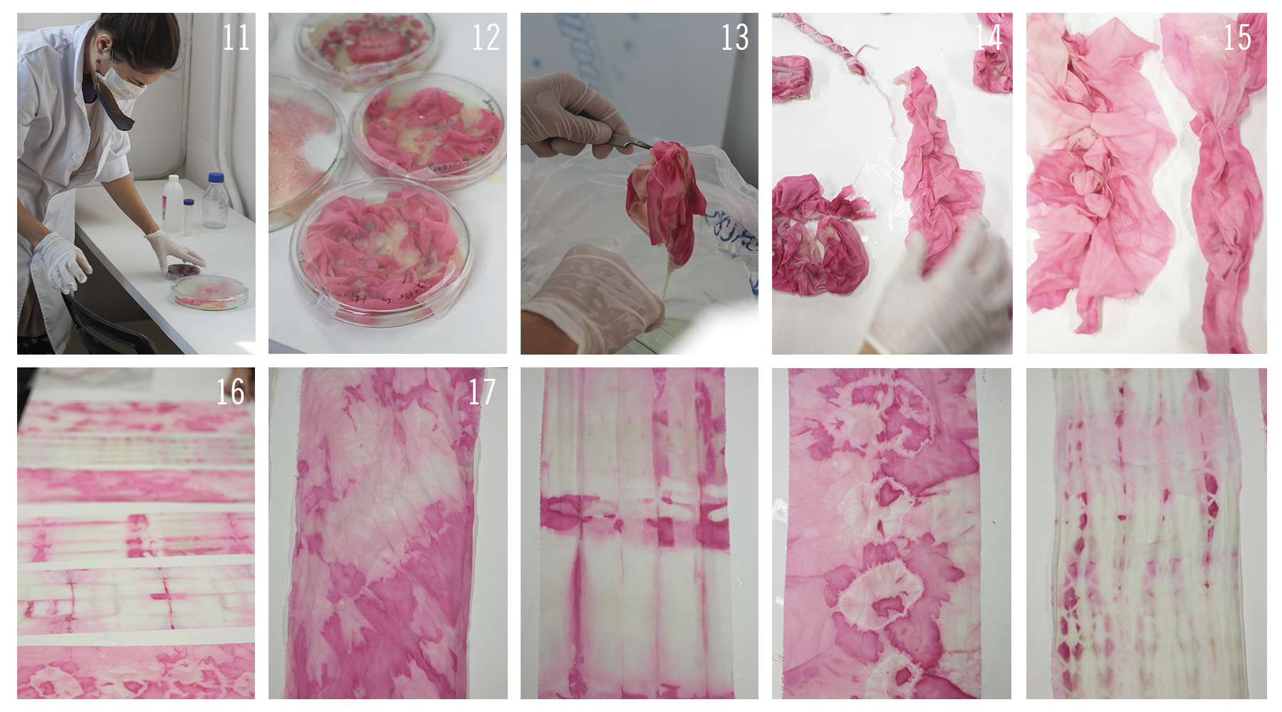 - 1 The textile used was silk, each student applied a technique (folds, knots, seams …) to generate different patterns in the final finishing of the cloth, which is exciting since it depends on the growth of the bacteria in it and it is discovered at the end of the process. They are each arranged inside Petri dishes.