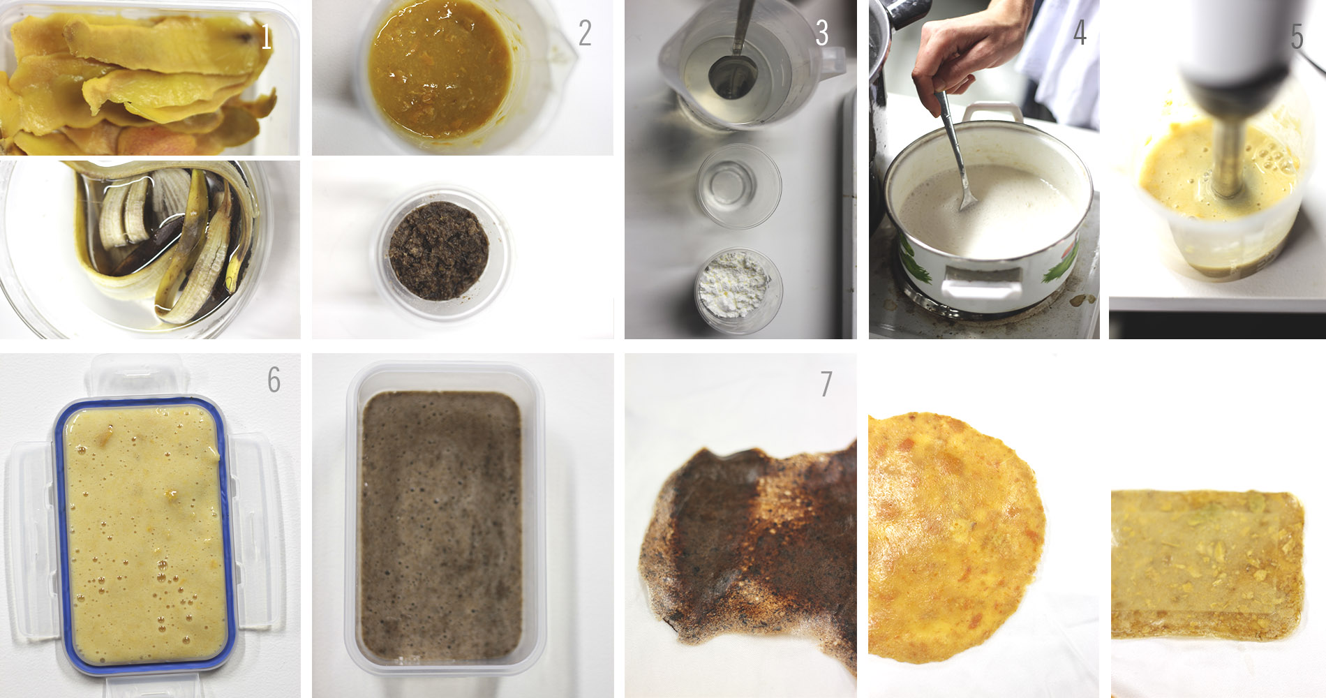 - 2 I processed the skins and drained the surplus water. Obtaining 3gr of mango skin and 5gr of processed banana skin. I divided these contents to try different recipes.