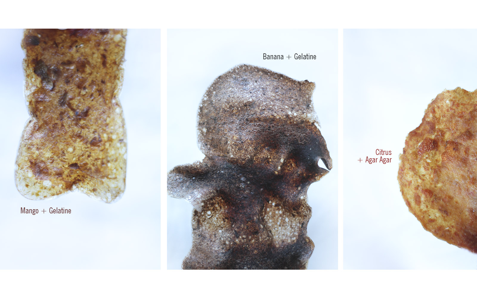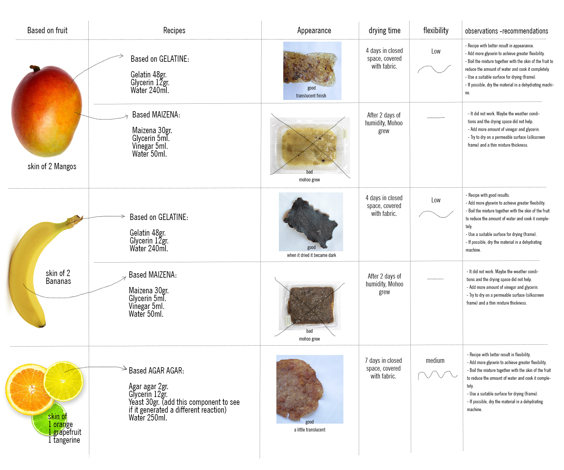 After waiting a few days to reach the drying of the Bio-materials, I have come to the personal conclusion that the most appropriate recipe is Gelatin; since it had a faster drying and translucent finish that allows to see the fruit fibers. The corn-based recipe did not work for me, during the days of waiting for its drying, mushrooms appeared (mohoo) and I had to discard them. The recipe of Agar Agar still remains with some humidity (5 days later) but in favor, the material has more flexibility. - The points to check to get to the material that I intend to result in “fruit leather” textile use is to add more glycerin to achieve greater flexibility and use a suitable surface for drying: rack (I read that those used for screen printing give very good result , since they allow air flow on both surfaces but the screen of the mesh is sufficiently closed and non-stick so that the freshly cooked bio material does not leak). - To avoid the formation of mohoo in the material, it should have boiled the mixture together with the fruit skin to reduce the amount of water and cook it completely. This step I could not carry out in this first stage of experimentation since in the laboratory we had elements of group use and the neutral mixture of binder was distributed among several students, so that each one would mix it with their chosen ingredients (in my case the fruit skins). Also, I still want to continue experimenting and refining my recipe, to reach the expected result and thus include this type of material in my final project, this is only the Bio-start!