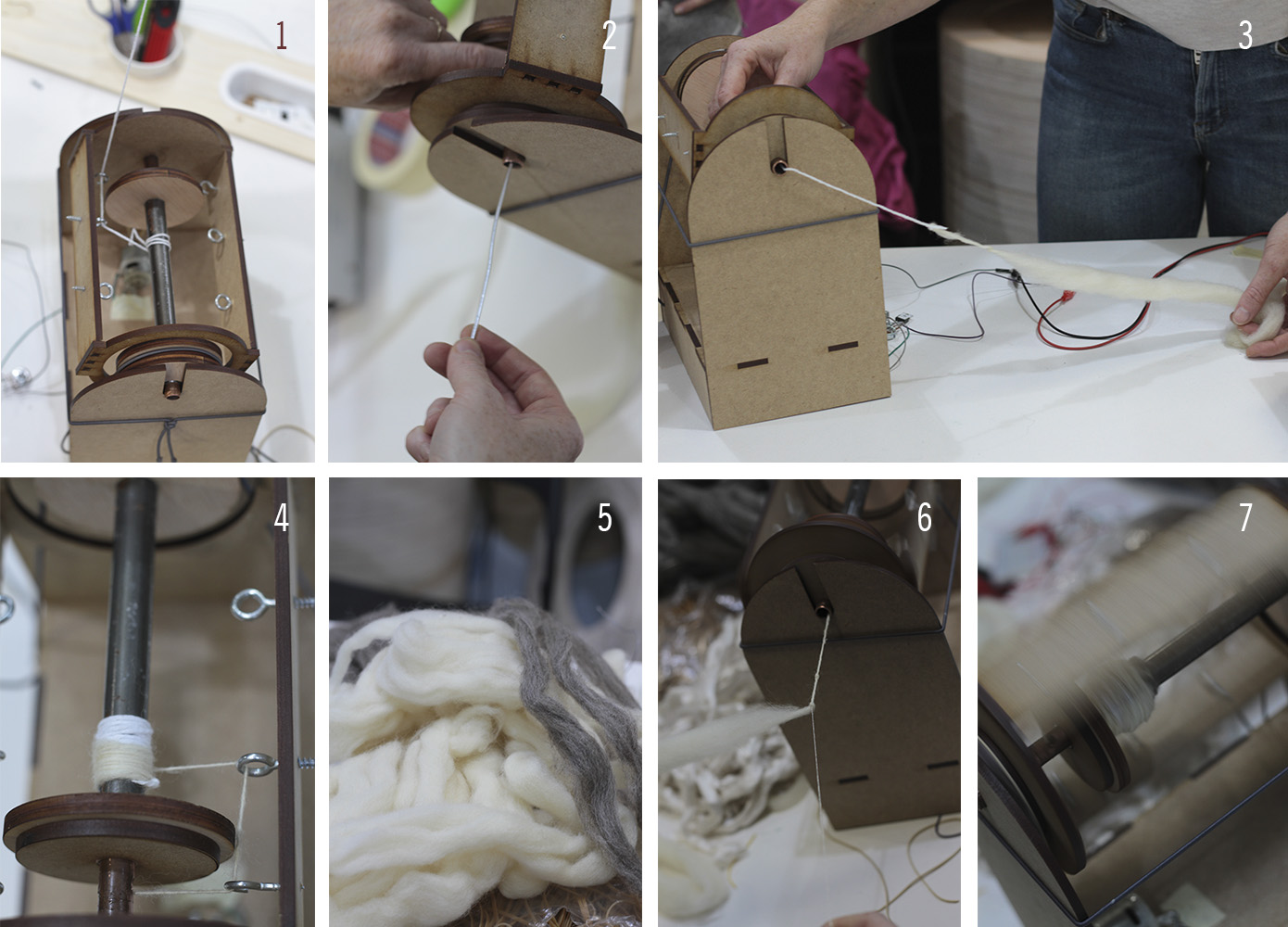 - 6 Conductive yarn: thinking about future applications, we conduct yarn tests with conductive yarn internally wrapped (enlisted) in wool. This technique requires greater precision and dexterity since a fiber is held in each hand.