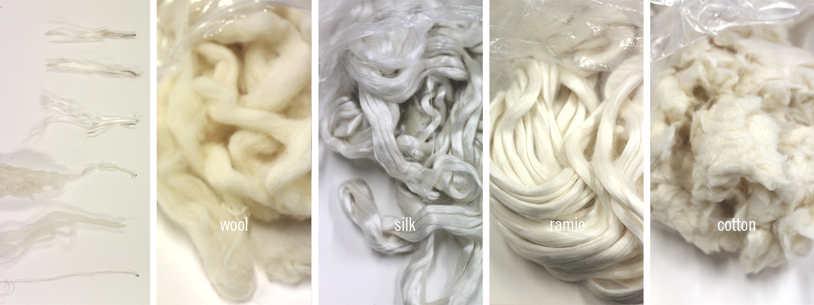 In this first experimentation with spinning, we decided to use fibers of natural origin such as wool, silk, ramie and cotton. To identify whether they are natural or plastic we can use the “trick” of burning the fiber, by its smell (the natural ones have a sweet aroma and some smell of burned hair) and by the reaction of it (the plastic melts) we can classify them. As I have already mentioned, the most faithful fiber to start spinning is wool, then another fiber can be introduced in the yarn, mixing materials and thus see and analyze performance. Silk, obviously has a beautiful finish, but it is a hard fiber to spin; of similar finish but with greater flexibility we find the Ramie (it is a flowering plant in the Urticaceae nettle family, native to eastern Asia). Cotton, one of the noblest textile materials, has short and less flexible filaments, but is very soft to the touch to spin.