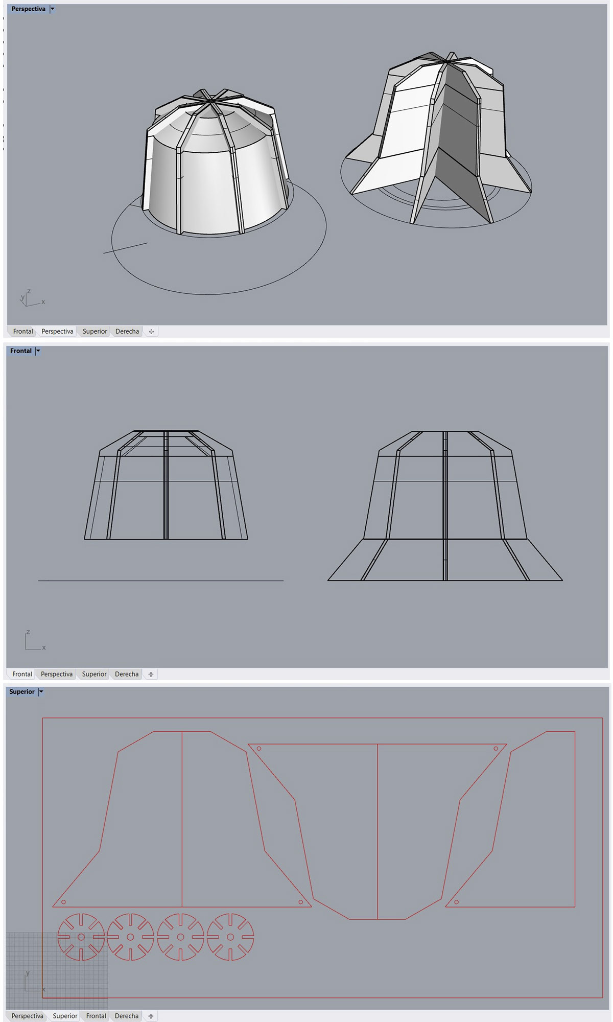 I started by designing the volume in 3D in Rhino, to visualize the shape that the volume covered in thread would take and then creating the sections in which it would be supported. Although the piece in which I worked in the beginning could be printed in 3D and achieve perhaps more complexity in its form, it would take many hours consuming too much material; for which I decided to work in 2D for laser cutting and thus build a radial mold through pieces embedded in a vertical direction around an axis. Which can then be anchored to a rotating table. This process can be improved in the future by adding a crank or motor for its rotation