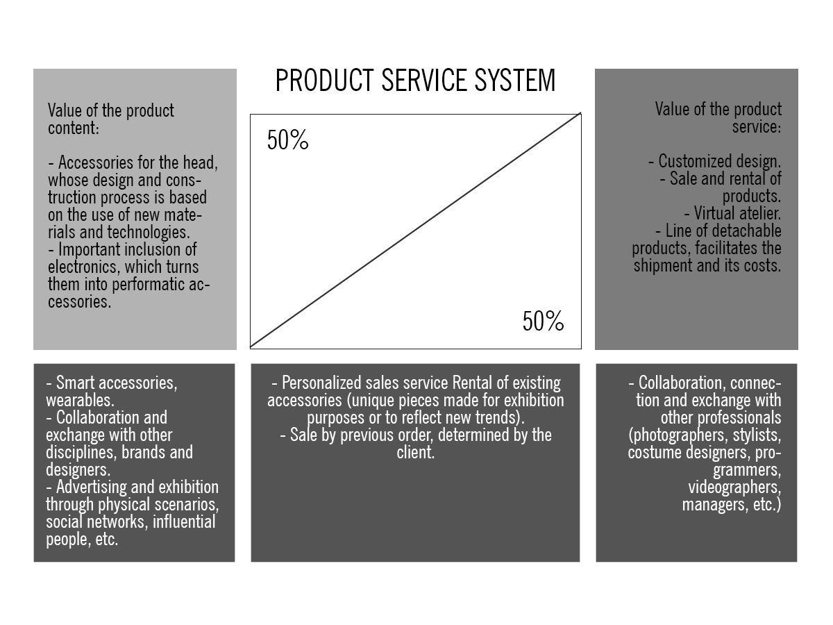 - A line for specific customers / Aligned with your style and profession: where the accessory becomes a portable piece. Here the niche is much smaller and the design of each product must be ultra-personalized as it can respond to physical and functional characteristics related to disciplines such as performers, musicians, actors, costumers, etc. This is where the avant-garde profile of the firm opens up, with the possibility of applying designs based on unique computational files, incorporating electronics to achieve performative effects (that respond to the reading of a programmed sensor). The link with the client must be direct throughout the start of the design process until the final delivery, advice and in some cases maintenance (due to wear and tear in terms of physical and technological use).
