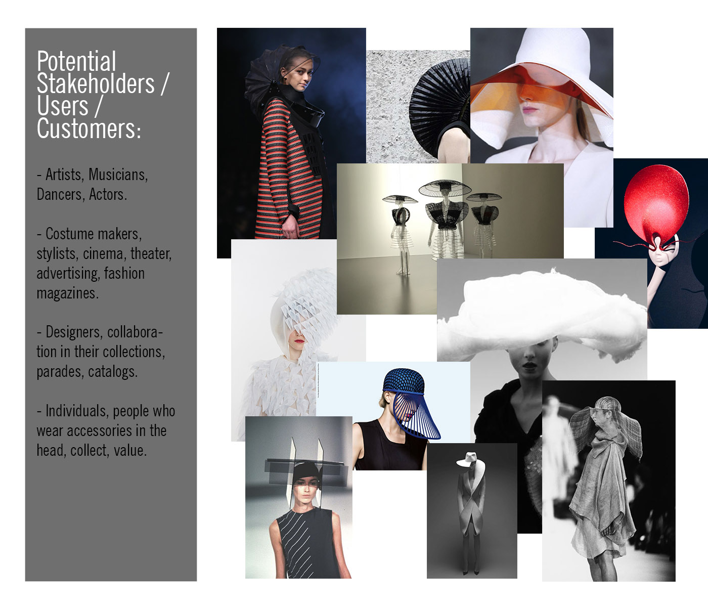 The accessories for the head, punctually the hat, was suffering a decrease in its use with the passing of the decades; in times of yesteryear it was an indispensable accessory both for functional reasons, as well as for a symbol of social status and prestige. From there also born the headdresses, purely aesthetic accessories, directly related to eventualities of high society and royalty (which until now are preserved by protocol). This is a paradigm from which I would like to detach myself, although the niche of users to which I point is reduced (not everyone is encouraged to go out with an accessory on their head); the range of typologies that I intend to cover from an urban chapter to a unique piece that can be part of the costume of a character in the performing arts.