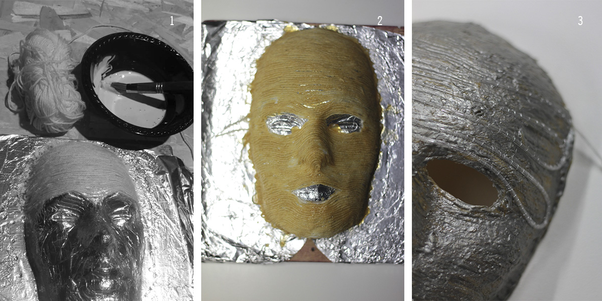 - 1 To make the mask, I used a positive face mold of carved wood with the milling machine. To protect it I covered it with metal paper. First with a brush apply a layer of latex in a horizontal direction and then I was arranging the wire in a continuous zigzag from one end to the other (leaving empty the sectors of eyes and mouth).