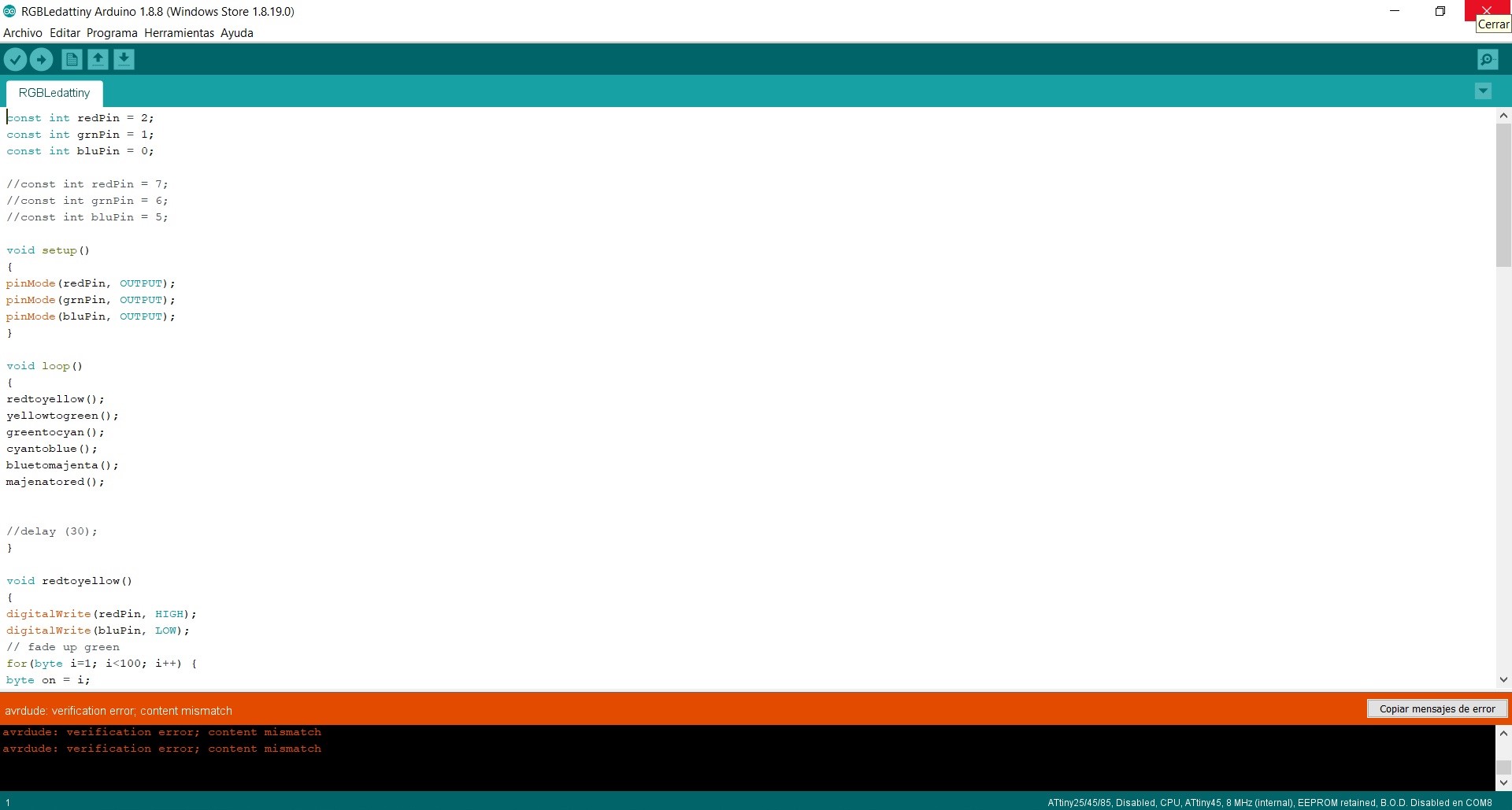 - 1 All the programming of the electronic system was carried out with the Arduino software and with the Arduino UNO board in its initial phase. First a test of the operation of the RGB led and the code was carried out. To adapt the system to the wearable, the ATtiny85 microcontroller programmed through the AVR board of Sparkfun was used.