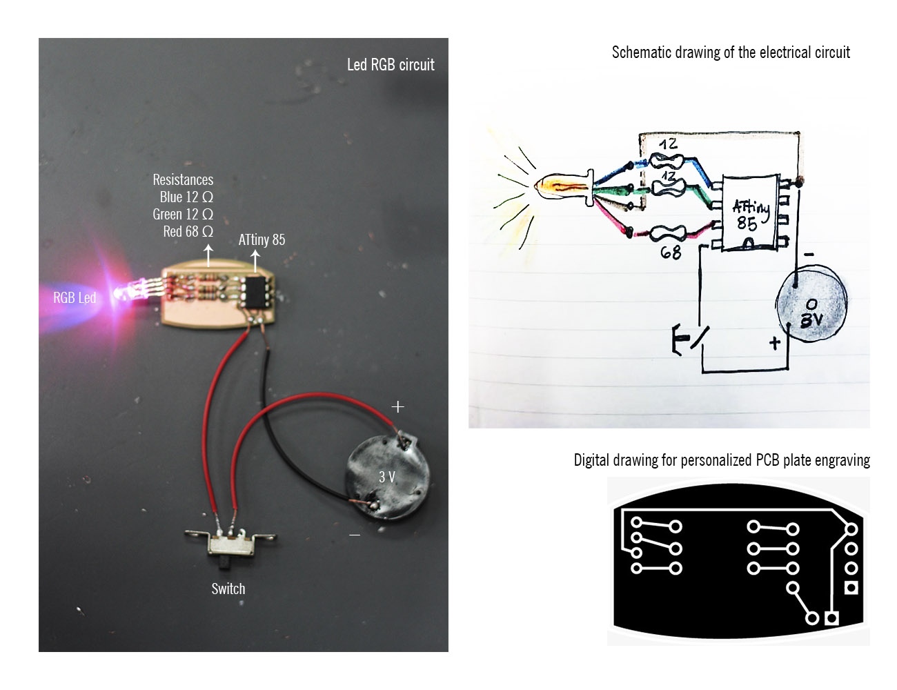 In the first place, it is necessary to make a schematic drawing of the circuit, calculate resistances taking into account the voltage (in this case 3V) to understand its operation. Then with the help of the Fritzing program, we introduce the same scheme that we physically tested on the bred board and it helps us to create the 2D drawing at scale, with standard parameters of the components, for its subsequent milling and optimal operation.