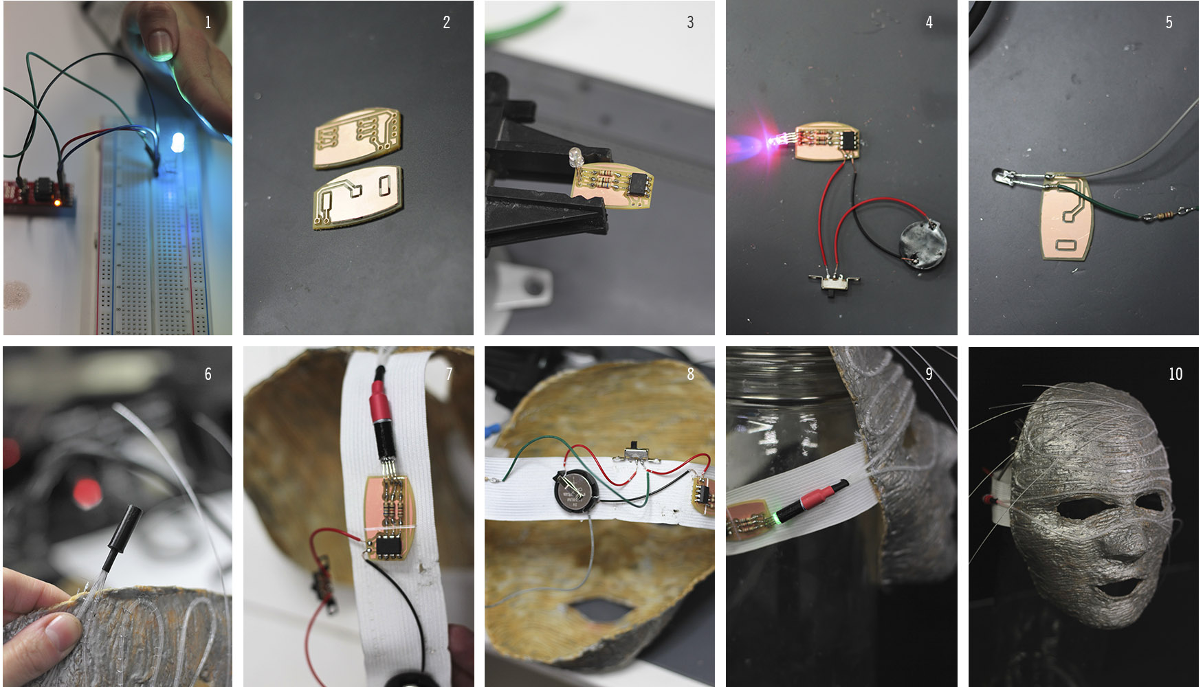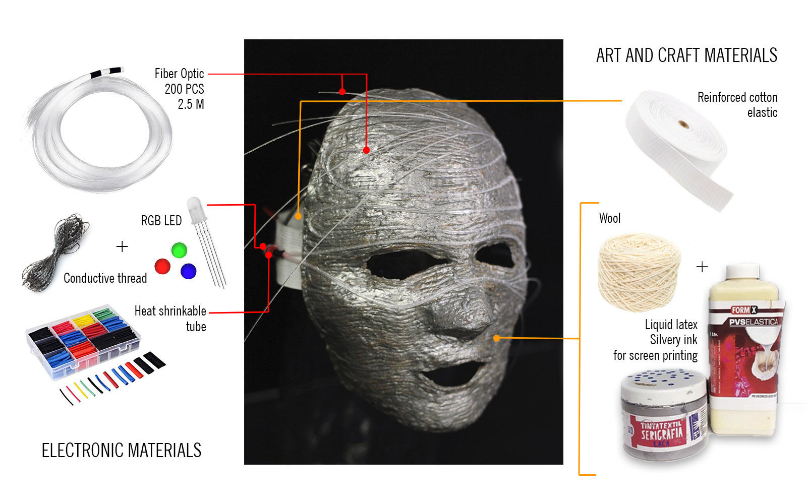 Fiber optic is currently the most advanced medium for the transmission of information through the reflection of light. One of its advantages is the transmission of light of any color without electricity and without heat, which makes it a possible tool to use in wearables. When combined with a light source RGB Led offers a traveling light pattern of scaled combinations between the colors Red, green and blue that fused with the metal surface of the mask generates an aesthetic permeated by technology. To take advantage of the LED luminescence, it is necessary to “encapsulate” the beam of light; for this I used a special piza (printed in 3D) that connects directly and perpendicularly the beam of light with the optical fiber.