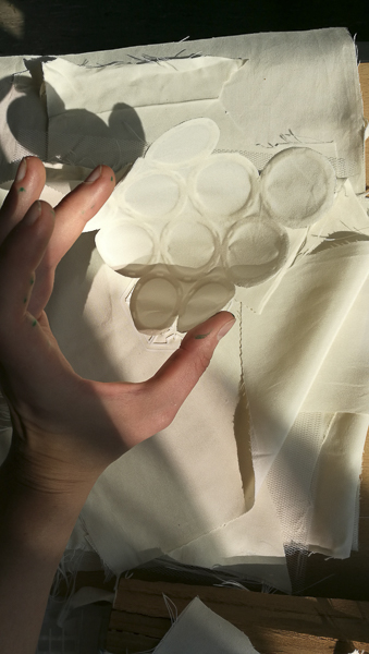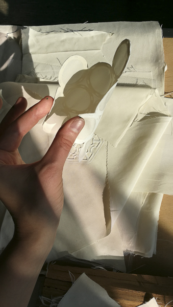 The silk is very thin and we need to find the direction of the threads, droit fil in french.