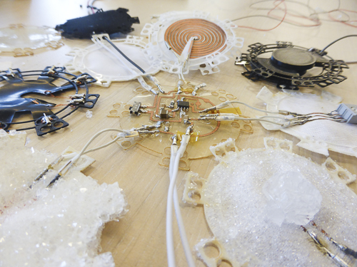 This device could be on the skin, or close to the skin and around the hear, the battery and the jack will be on a piece of fabric on the body * A speaker : coil shape size of a 40 mm circle shape * A circle circuit * A modular connexions device between the electronic parts * A shape for differents surfaces like differents body, human or non-human